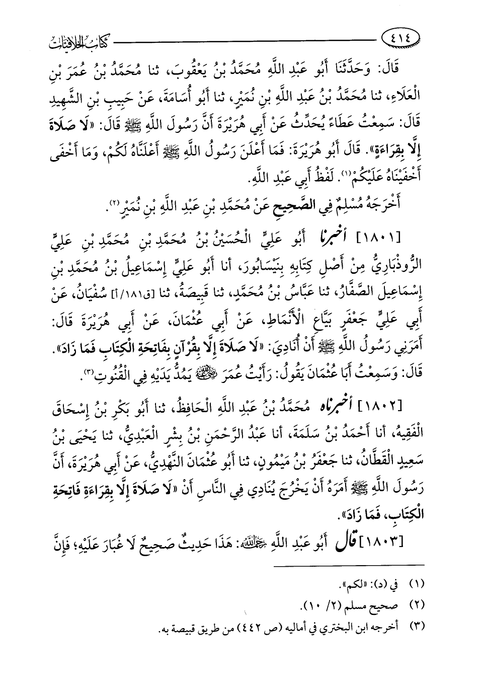 [1802] أخبرناه مُحَمَّدُ بْنُ عَبْدِ اللَّهِ الْحَافِظُ، ثنا أَبُو بَكْرِ بْنُ إِسْحَاقَ الْفَقِيهُ، أنا أَحْمَدُ بْنُ سَلَمَةَ، أنا عَبْدُ الرَّحْمَنِ بْنُ بِشْرٍ الْعَبْدِيُّ، ثنا يَحْيَى بْنُ سَعِيدٍ الْقَطَّانُ، ثنا جَعْفَرُ بْنُ مَيْمُونٍ، ثنا أَبُو عُثْمَانَ النَّهْدِيُّ، عَنْ أَبِي هُرَيْرَةَ، أَنَّ رَسُولَ اللَّهِ - صلى الله عليه وسلم - أَمَرَهُ أَنْ يَخْرُجَ يُنَادِي فِي النَّاسِ أَنْ "لَا صلَاةَ إِلَّا بِقِرَاءَةِ فَاتِحَةِ الْكِتَابِ، فَمَا زَادَ".
