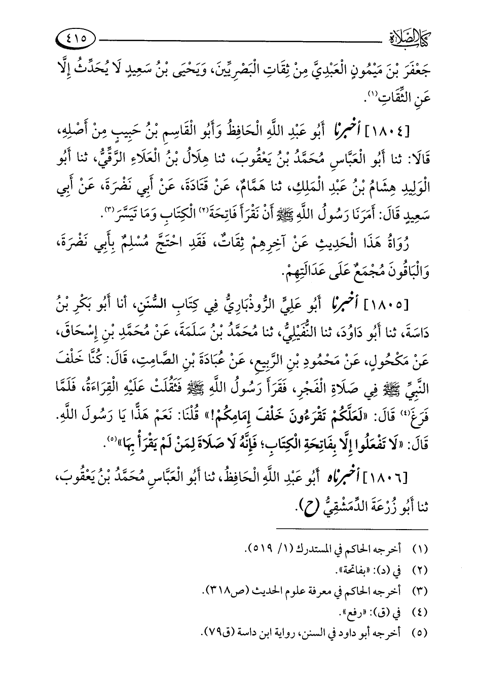 [1805] أخبرنا أَبُو عَلِيٍّ الرُّوذْبَارِيُّ فِي كِتَابِ السُّنَنِ، أنا أَبُو بَكْرِ بْنُ دَاسَةَ، ثنا أَبُو دَاوُدَ، ثنا النُّفَيْلِيُّ، ثنا مُحَمَّدُ بْنُ سَلَمَةَ، عَنْ مُحَمَّدِ بْنِ إِسْحَاقَ، عَنْ مَكْحُولٍ، عَنْ مَحْمُودِ بْنِ الرَّبِيعِ، عَنْ عُبَادَةَ بْنِ الصَّامِتِ، قَالَ: كُنَّا خَلْفَ النَّبِيِّ - صلى الله عليه وسلم - في صَلَاةِ الْفَجْرِ، فَقَرَأَ رَسُولُ اللَّهِ - صلى الله عليه وسلم - فَثَقُلَتْ عَلَيْهِ الْقِرَاةُ، فَلَمَّا فَرَغَ (¬4) قَالَ: "لَعَلَّكُمْ تَقْرَءُونَ خَلْفَ إِمَامِكُمْ! " قُلْنَا: نَعَمْ هَذًّا يَا رَسُولَ اللَّهِ. قَالَ: "لَا تَفْعَلُوا إِلَّا بِفَاتِحَةِ الْكِتَابِ؛ فَإِنَّهُ لَا صَلَاةَ لِمَنْ لَمْ يَقْرَأْ بِهَا" (¬5).