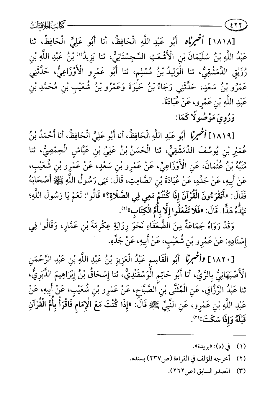 [1819] أخبرنا أَبُو عَبْدِ اللَّهِ الْحَافِظُ، أنا أَبُو عَلِيٍّ الْحَافِظُ، أنا أَحْمَدُ بْنُ عُمَيْرِ بْنِ يُوسُفَ الدِّمَشْقِيُّ، ثنا الْحَسَنُ بْنُ عَلِيِّ بْنِ عَيَّاشٍ الْحِمْصِيُّ، ثنا مُنَبِّهُ بْنُ عُثْمَانَ، عَنِ الْأَوْزَاعِيِّ، عَنْ عَمْرِو بْنِ سَعْدٍ، عَنْ عَمْرِو بْنِ شُعَيْبٍ، عَنْ أَبِيهِ، عَنْ جَدِّهِ، عَنْ عُبَادَةَ بْنِ الصَّامِتِ، قَالَ: نَهَى رَسُولُ اللَّهِ - صلى الله عليه وسلم - أَصْحَابَهُ فَقَالَ: "أَتَقْرَءُونَ الْقُرآنَ إِذَا كُنْتُمْ مَعِي فِي الصَّلَاةِ؟ " قَالُوا: نَعَمْ يَا رَسُولَ اللَّهِ؛ نَهُذُّهُ هَذًّا. قَالَ: "فَلَا تَفْعَلُوا إِلَّا بِأُمِّ الْكِتَابِ" (¬2).