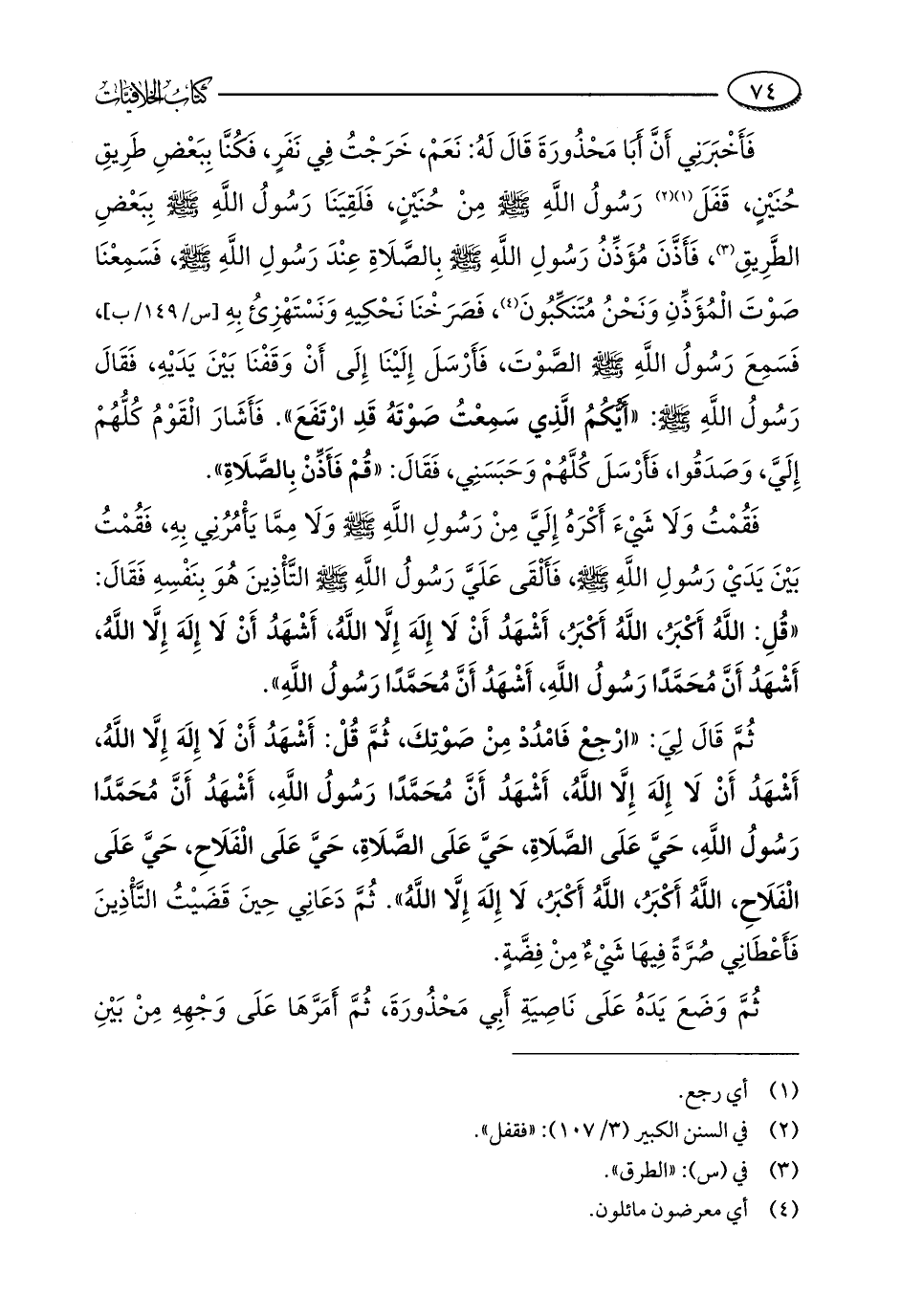فَأَخْبَرَنِي أَنَّ أَبَا مَحْذُورَةَ قَالَ لَهُ: نَعَمْ، خَرَجْتُ فِي نَفَرٍ، فكُنَّا بِبَعْضِ طَرِيقِ حُنَيْنٍ، قَفَلَ (¬1) (¬2) رَسُولُ اللَّهِ - صلى الله عليه وسلم - منْ حُنَيْنٍ، فَلَقِيَنَا رَسُولُ اللَّهِ - صلى الله عليه وسلم - بِبَعْضِ الطَّرِيقِ (¬3)، فَأَذَّنَ مُؤَذِّنُ رَسُولِ اللَّهِ - صلى الله عليه وسلم - بِالصَّلَاةِ عِنْدَ رَسُولِ اللَّهِ - صلى الله عليه وسلم -، فَسَمِعْنَا صَوْتَ الْمُؤَذِّنِ وَنَحْنُ مُتَنَكِّبُونَ (¬4)، فَصَرَخْنَا نَحْكِيهِ وَنَسْتَهْزِئُ بِهِ، فَسَمِعَ رَسُولُ اللَّهِ - صلى الله عليه وسلم - الصَّوْتَ، فَأَرْسَلَ إِلَيْنَا إِلَى أَنْ وَقَفْنَا بَيْنَ يَدَيْهِ، فَقَالَ رَسُولُ اللَّهِ - صلى الله عليه وسلم -: "أَيُّكُمُ الَّذِي سَمِعْتُ صَوْتُهُ قَدِ ارْتَفَعَ". فَأَشَارَ الْقَوْمُ كُلُّهُمْ إِلَيَّ، وَصَدَقُوا، فَأَرْسَلَ كُلَّهُمْ وَحَبَسَنِي، فَقَالَ: "قُمْ فَأَذِّنْ بِالصَّلَاةِ".