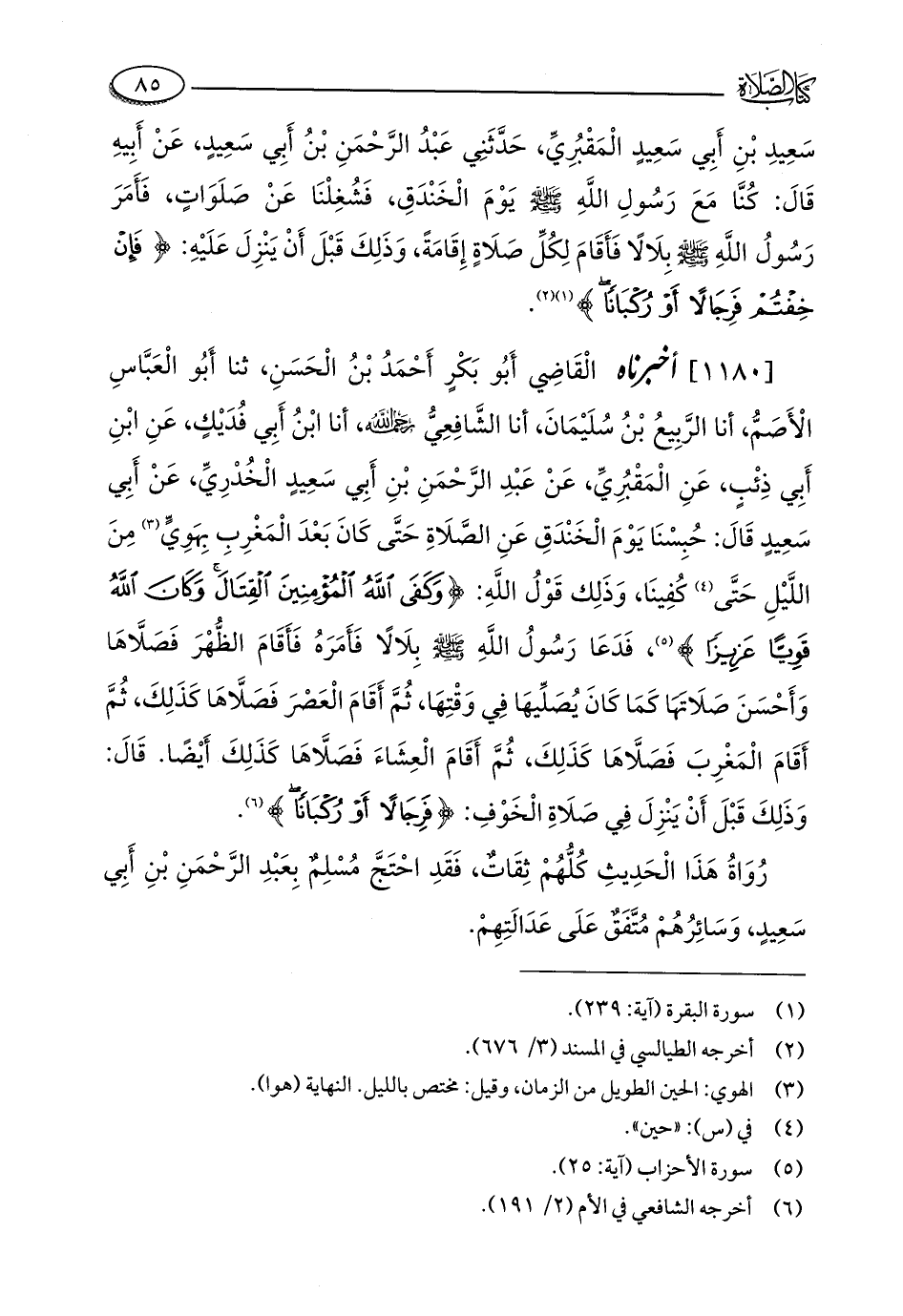 [1180] أخبرناه الْقَاضِي أَبُو بَكْرٍ أَحْمَدُ بْنُ الْحَسَنِ، ثنا أَبُو الْعَبَّاسِ الْأَصَمُّ، أنا الرَّبِيعُ بْنُ سُلَيْمَانَ، أنا الشَّافِعِيُّ - رحمه الله -، أنا ابْنُ أَبِي فُدَيْكٍ، عَنِ ابْنِ أَبِي ذِئْبٍ، عَنِ الْمَقْبُرِيِّ، عَنْ عَبْدِ الرَّحْمَنِ بْنِ أَبِي سَعِيدٍ الْخُدْرِيِّ، عَنْ أَبِي سَعِيدٍ قَالَ: حُبِسْنَا يَوْمَ الْخَنْدَقِ عَنِ الصَّلَاةِ حَتَّى كَانَ بَعْدَ الْمَغْرِبِ بِهَوِيٍّ (¬3) مِنَ اللَّيْلِ حَتَّى (¬4) كُفِينَا، وَذَلِك قَوْلُ اللَّهِ: {وَكَفَى اللَّهُ الْمُؤْمِنِينَ الْقِتَالَ وَكَانَ اللَّهُ قَوِيًّا عَزِيزًا} (¬5)، فَدَعَا رَسُولُ اللَّهِ - صلى الله عليه وسلم - بِلَالًا فَأَمَرَهُ فَأَقَامَ الظُّهْرَ فَصَلَّاهَا وَأَحْسَنَ صَلَاتَهَا كَمَا كَانَ يُصَلِّيهَا فِي وَقْتِهَا، ثُمَّ أَقَامَ الْعَصْرَ فَصَلَّاهَا كَذَلِكَ، ثُمَّ أَقَامَ الْمَغْرِبَ فَصَلَّاهَا كَذَلِكَ، ثُمَّ أَقَامَ الْعِشَاءَ فَصَلَّاهَا كَذَلِكَ أَيْضًا. قَالَ: وَذَلِكَ قَبْلَ أَنْ يَنْزِلَ فِي صَلَاةِ الْخَوْفِ: {فَرِجَالًا أَوْ رُكْبَانًا} (¬6).