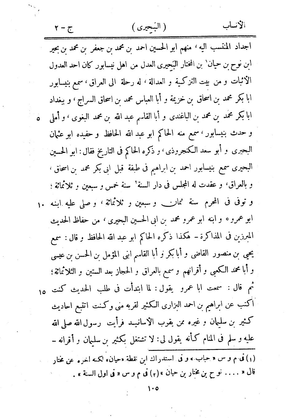 أجداد المنتسب اليه، منهم ابو الحسين احمد بن محمد بن جعفر بن محمد بن بحير ابن نوح بن حيان [1] بن المختار البَحِيرى العدل من أهل نيسابور كان أحد العدول الأثبات ومن بيت التزكية والعدالة، له رحلة الى العراق، سمع بنيسابور ابا بكر محمد بن إسحاق بن خزيمة وأبا العباس محمد بن إسحاق السراج، وببغداد ابا بكر محمد بن محمد بن الباغندي وأبا القاسم عبد الله بن محمد البغوي، وأملى وحدث بنيسابور، سمع منه الحاكم ابو عبد الله الحافظ وحفيده ابو عثمان البحيري وأبو سعد الكنجروذي، وذكره الحاكم في التاريخ فقال: ابو الحسين البحيري سمع بنيسابور احمد بن إبراهيم في طبقة قبل ابى بكر محمد بن إسحاق، وبالعراق، وعقدت له المجلس في دار السنة [2] سنة خمس وسبعين وثلاثمائة، وتوفى في المحرم سنة ثمان وسبعين وثلاثمائة، وصلى عليه ابنه ابو عمرو وابنه ابو عمرو محمد بن ابى الحسين البحيري، من حفاظ الحديث المبرزين في المذاكرة- هكذا ذكره الحاكم ابو عبد الله الحافظ وقال: سمع يحيى بن منصور القاضي وأبا بكر وأبا القاسم ابني المؤمل بن الحسن بن عيسى وأبا محمد الكعبي وأقرانهم وسمع بالعراق والحجاز بعد الستين والثلاثمائة، ثم قال: سمعت ابا عمرو يقول: لما ابتدأت في طلب الحديث كنت اكتب عن إبراهيم بن احمد البزاري الكثير لقربه منى وكنت أتتبع أحاديث كثير بن سليمان وغيره ممن يقرب الأسانيد فرأيت رسول الله صلى الله عليه وسلم في المنام كأنه يقول لي: لا تشتغل بكثير بن سليمان وأقرانه-