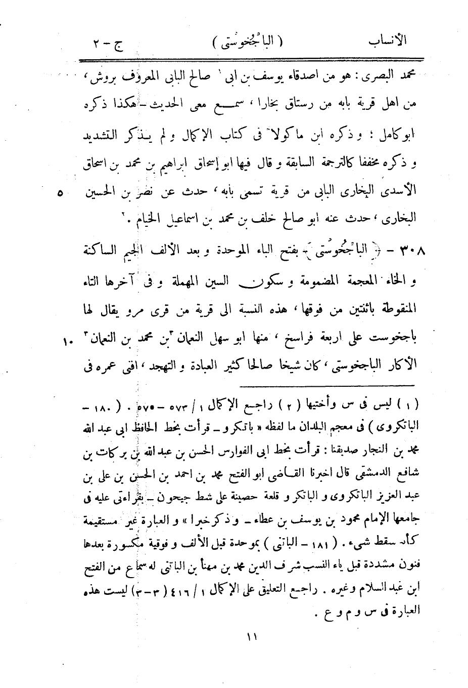 بفتح الباء الموحدة وبعد الألف الجيم الساكنة والخاء المعجمة المضمومة وسكون السين المهملة وفي آخرها التاء المنقوطة باثنتين من فوقها، هذه النسبة الى قرية من قرى مرو يقال لها باجخوست على اربعة فراسخ، منها ابو سهل النعمان [3] بن محمد بن النعمان [3] الأكار الباجخوستي، كان شيخا صالحا كثير العبادة والتهجد، أفنى عمره في