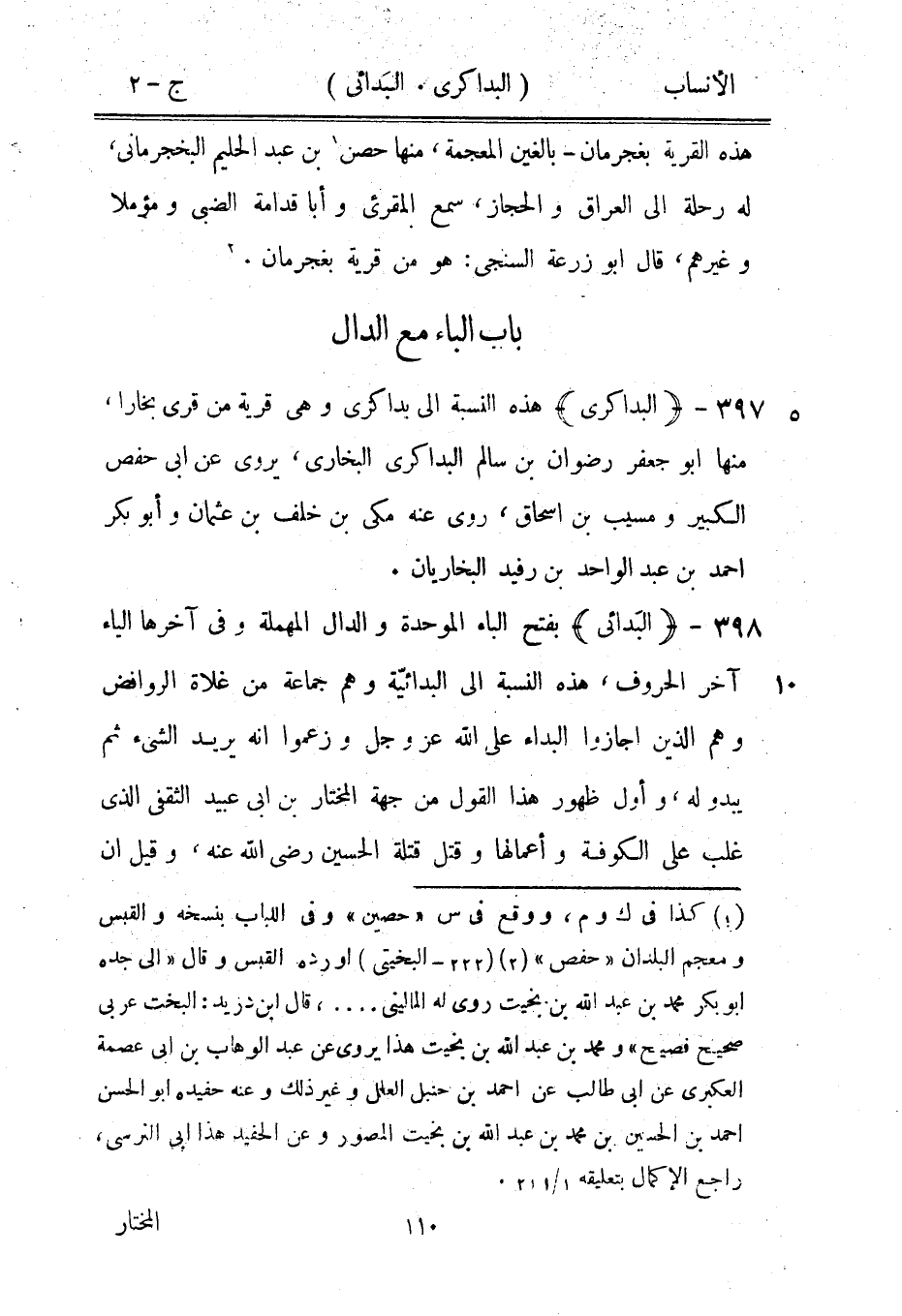 [2] (222- البخيتى) أورده القبس وقال «الى جده ابو بكر محمد بن عبد الله بن بخيت روى له الماليني ... ، قال ابن دريد: البخت عربي صحيح فصيح» ومحمد بن عبد الله بن بخيت هذا يروى عن عبد الوهاب بن ابى عصمة العكبريّ عن ابى طالب عن احمد بن حنبل العلل وغير ذلك وعنه حفيده ابو الحسن احمد بن الحسين بن محمد بن عبد الله بن بخيت المصور وعن الحفيد هذا ابى النرسي، راجع الإكمال بتعليقه 1/ 211.