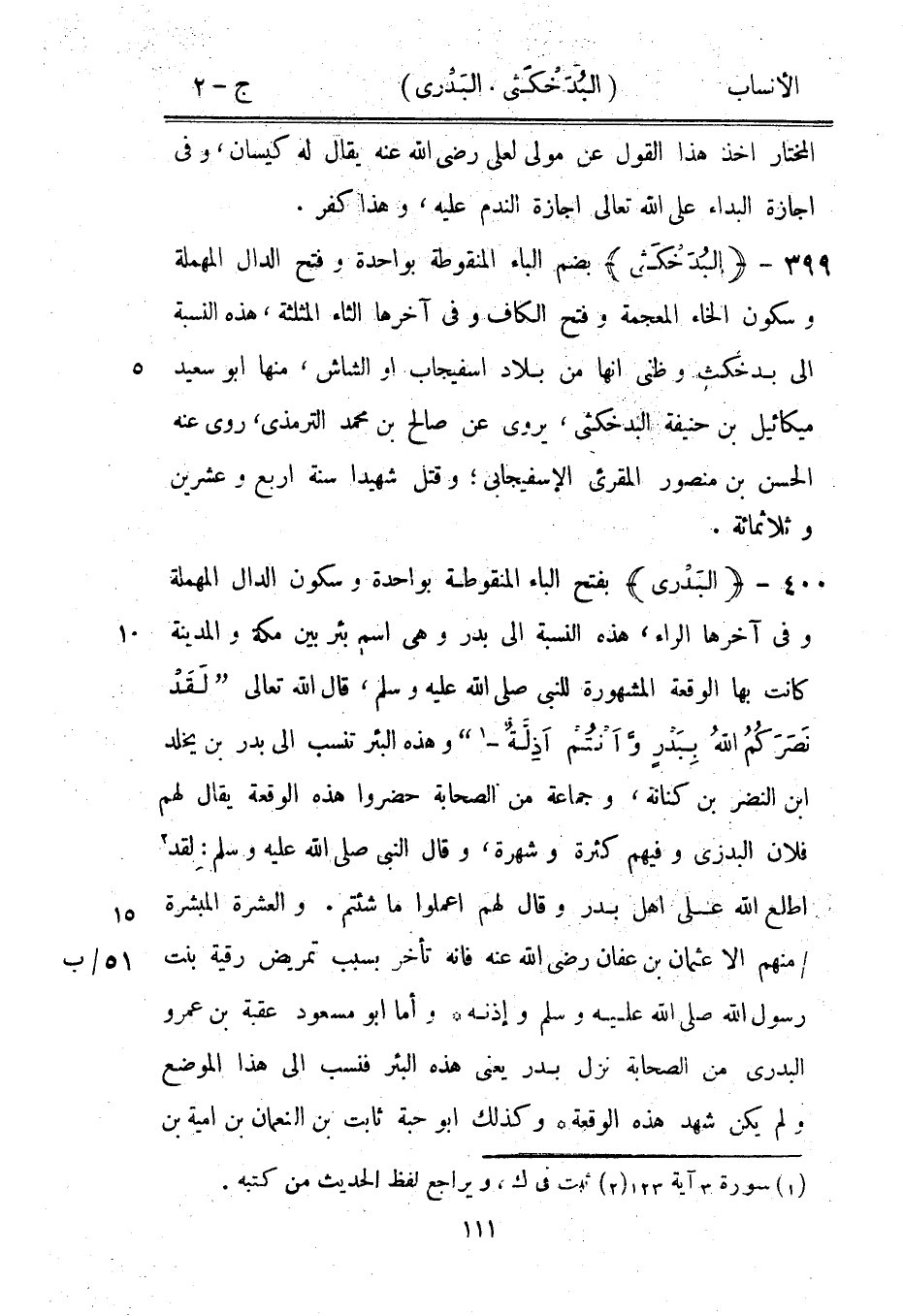 بفتح الباء المنقوطة بواحدة وسكون الدال المهملة وفي آخرها الراء، هذه النسبة الى بدر وهي اسم بئر بين مكة والمدينة كانت بها الوقعة المشهورة للنّبيّ صلى الله عليه وسلم، قال الله تعالى لَقَدْ نَصَرَكُمُ الله بِبَدْرٍ وَأَنْتُمْ أَذِلَّةٌ 3: 123-[1] وهذه البئر تنسب الى بدر بن يخلد ابن النضر بن كنانة، وجماعة من الصحابة حضروا هذه الوقعة يقال لهم فلان البدري وفيهم كثرة وشهرة، وقال النبي صلى الله عليه وسلم: لقد [2] اطلع الله على أهل بدر وقال لهم اعملوا ما شئتم. والعشرة المبشرة/ منهم الا عثمان بن عفان رضى الله عنه فإنه تأخر بسبب تمريض رقية بنت 51/ ب رسول الله صلى الله عليه وسلم وإذنه وأما ابو مسعود عقبة بن عمرو البدري من الصحابة نزل بدر يعنى هذه البئر فنسب الى هذا الموضع ولم يكن شهد هذه الوقعة وكذلك ابو حبة ثابت بن النعمان بن أمية بن