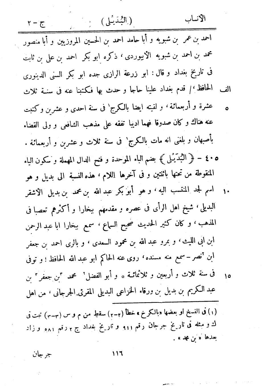 بضم الباء الموحدة وفتح الدال المهملة وسكون الياء المنقوطة من تحتها باثنتين وفي آخرها اللام، هذه النسبة الى بديل وهو اسم لجد المنتسب اليه، وهو أبو بكر عبد الله بن محمد بن بديل الأشقر البديلي، شيخ أهل الرأى في عصره ومقدمهم ببخارا وأكثرهم تعصبا في المذهب، وكان كثير الحديث صحيح السماع، سمع ببخارا ابا عبد الرحمن ابن ابى الليث، وبمرو عبد الله بن محمود السعدي، وبالري احمد بن جعفر ابن [2] نصر- سمع منه مسندة، روى عنه الحاكم ابو عبد الله الحافظ، وتوفى في سنة ثلاث وأربعين وثلاثمائة وأبو الفضل [2] محمد [3] بن جعفر [3] بن عبد الكريم بن بديل بن ورقاء الخزاعي البديلي المقرئ الجرجاني، من أهل