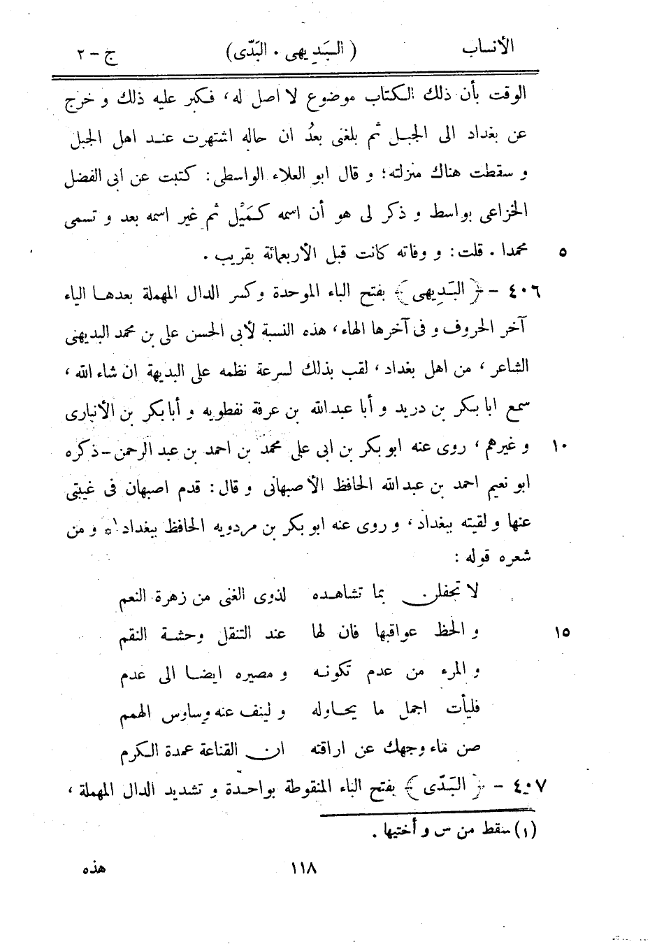 بفتح الباء الموحدة وكسر الدال المهملة بعدها الياء آخر الحروف وفي آخرها الهاء، هذه النسبة لأبى الحسن على بن محمد البديهي الشاعر، من أهل بغداد، لقب بذلك لسرعة نظمه على البديهة ان شاء الله، سمع ابا بكر بن دريد وأبا عبد الله بن عرفة نفطويه وأبا بكر بن الأنباري وغيرهم، روى عنه ابو بكر بن ابى على محمد بن احمد بن عبد الرحمن- ذكره ابو نعيم احمد بن عبد الله الحافظ الأصبهاني وقال: قدم أصبهان في غيبتي عنها ولقيته ببغداد، وروى عنه ابو بكر بن مردويه الحافظ ببغداد [1] ومن شعره قوله: