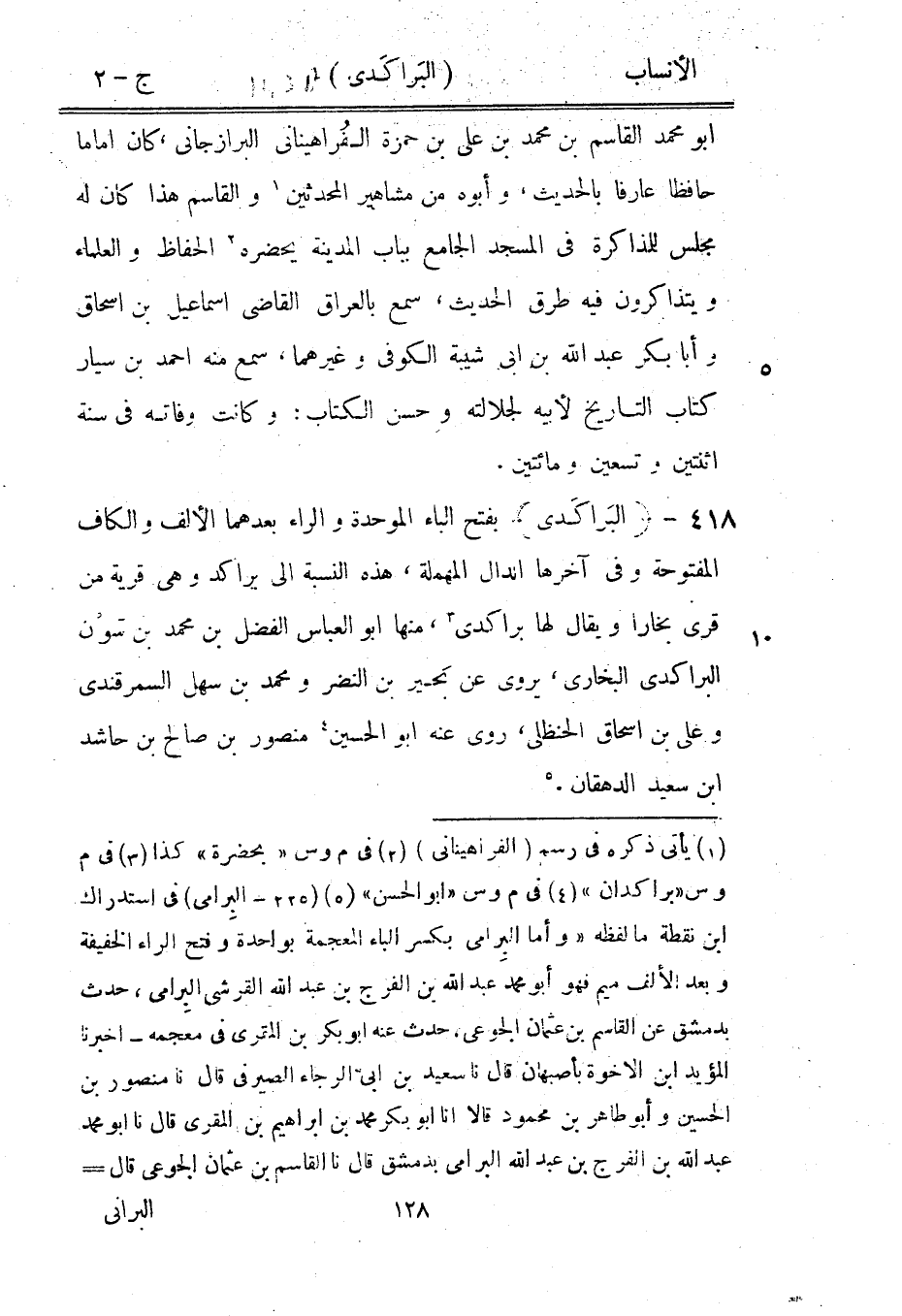 [5] (225- البِرامى) في استدراك ابن نقطة ما لفظه «وأما البِرامى بكسر الباء المعجمة بواحدة وفتح الراء الخفيفة وبعد الألف ميم فهو أبو محمد عبد الله بن الفرج بن عبد الله القرشي البرامي، حدث بدمشق عن القاسم بن عثمان الجوعى، حدث عنه ابو بكر بن المقري في معجمه- أخبرنا المؤيد ابن الاخوة بأصبهان قال نا سعيد بن ابى الرجاء الصيرفي قال نا منصور بن الحسين وأبو طاهر بن محمود قالا انا ابو بكر محمد بن إبراهيم بن المقري قال نا ابو محمد عبد الله بن الفرج بن عبد الله البرامي بدمشق قال نا القاسم بن عثمان الجوعى قال-