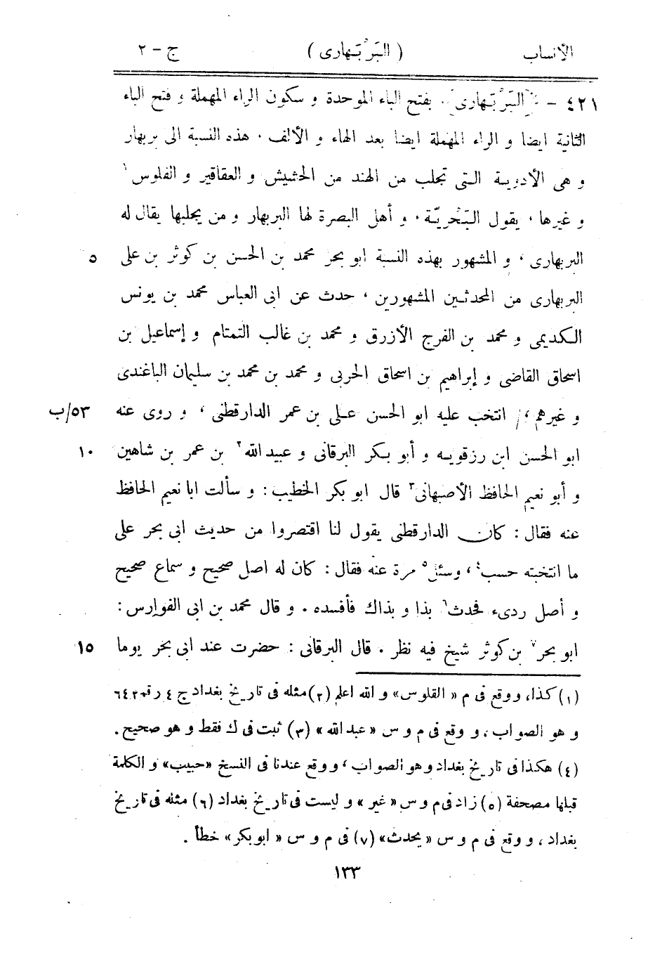 بفتح الباء الموحدة وسكون الراء المهملة وفتح الباء الثانية أيضا والراء المهملة أيضا بعد الهاء والألف. هذه النسبة الى بربهار وهي الأدوية التي تجلب من الهند من الحشيش والعقاقير والفلوس [1] وغيرها، يقول البَحريّة، وأهل البصرة لها البربهار ومن يجلبها يقال له البربهاري، والمشهور بهذه النسبة ابو بحر محمد بن الحسن بن كوثر بن على البربهاري من المحدثين المشهورين، حدث عن ابى العباس محمد بن يونس الكديمي ومحمد بن الفرج الأزرق ومحمد بن غالب التمتام وإسماعيل بن إسحاق القاضي وإبراهيم بن إسحاق الحربي ومحمد بن محمد بن سليمان الباغندي وغيرهم،/ انتخب عليه ابو الحسن على بن عمر الدارقطنيّ، وروى عنه 53/ ب ابو الحسن ابن رزقويه وأبو بكر البرقاني وعبيد الله [2] بن عمر بن شاهين وأبو نعيم الحافظ الأصبهاني [3] قال ابو بكر الخطيب: وسألت ابا نعيم الحافظ عنه فقال: كان الدارقطنيّ يقول لنا اقتصروا من حديث ابى بحر على ما انتخبته حسب [4] ، وسئل [5] مرة عنه فقال: كان له أصل صحيح وسماع صحيح وأصل رديء فحدث [6] بذا وبذاك فأفسده. وقال محمد بن ابى الفوارس: