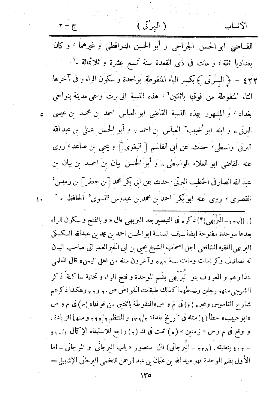 [1] (227- البَربَهى (؟) ذكره في التبصير بعد البريهى قال «وبالفتح وسكون الراء بعدها موحدة مفتوحة أيضا سيف السنة ابو الحسن احمد بن محمد بن عبد الله السكسكي البربهى الفقيه الشافعيّ أجل أصحاب الشيخ يحيى بن ابى الخير العمراني صاحب البيان له تصانيف وكرامات ومات سنة 586 وآخرون مثله من أهل اليمن» قال المعلمي هذا وهم والمعروف بنو البُرَيهى بضم الموحدة وفتح الراء وتحتية ساكنة ذكر الشرجى منهم رجلين وضبطهما كذلك طبقات الخواص ص 60 و 76 وهكذا ذكرهم شارح القاموس وغيره