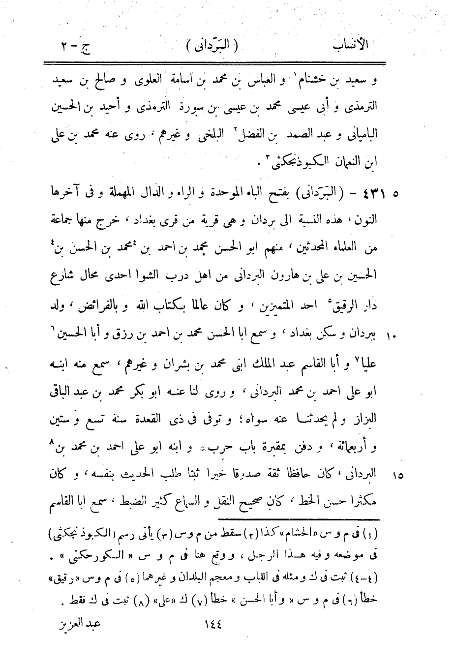 بفتح الباء الموحدة والراء والدال المهملة وفي آخرها النون، هذه النسبة الى بردان وهي قرية من قرى بغداد، خرج منها جماعة من العلماء المحدثين، منهم ابو الحسن محمد بن احمد بن [4] محمد بن الحسن بن [4] الحسين بن على بن هارون البرداني من أهل درب الشوا احدى محال شارع دار الرقيق [5] أحد المتميزين، وكان عالما بكتاب الله وبالفرائض، ولد ببردان وسكن بغداد، وسمع ابا الحسن محمد بن احمد بن رزق وأبا الحسين [6] عليا [7] وأبا القاسم عبد الملك ابني محمد بن بشران وغيرهم، سمع منه ابنه ابو على احمد بن محمد البرداني، وروى لنا عنه ابو بكر محمد بن عبد الباقي البزاز ولم يحدثنا عنه سواه، وتوفى في ذي القعدة سنة تسع وستين وأربعمائة، ودفن بمقبرة باب حرب وابنه ابو على احمد بن محمد بن [8] البرداني، كان حافظا ثقة صدوقا خيرا ثبتا طلب الحديث بنفسه، وكان مكثرا حسن الخط، كان صحيح النقل والسماع كثير الضبط، سمع ابا القاسم