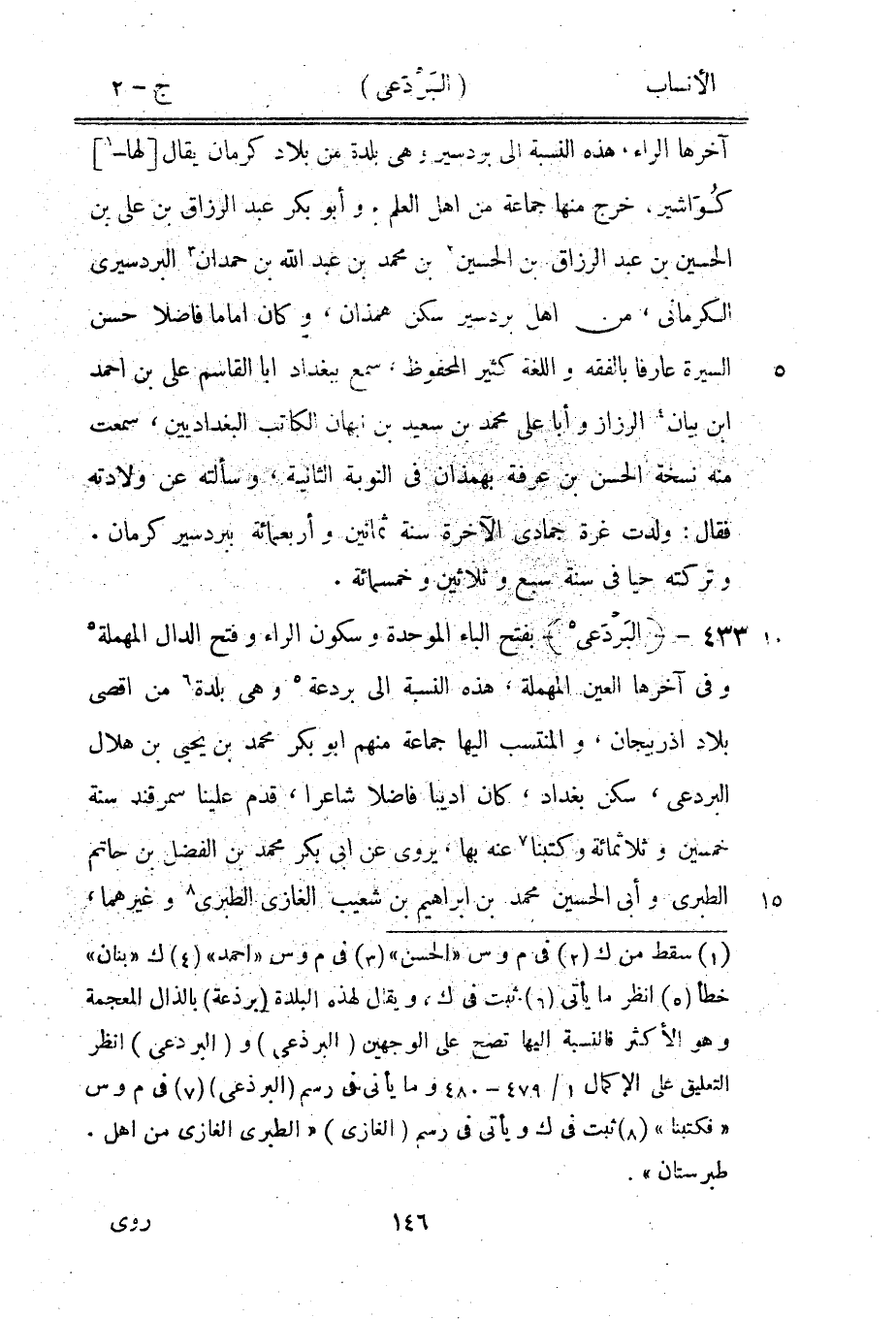 [5] بفتح الباء الموحدة وسكون الراء وفتح الدال المهملة [5] وفي آخرها العين المهملة، هذه النسبة الى بردعة [5] وهي بلدة [6] من أقصى بلاد آذربيجان، والمنتسب اليها جماعة منهم ابو بكر محمد بن يحيى بن هلال البردعي، سكن بغداد، كان أديبا فاضلا شاعرا، قدم علينا سمرقند سنة خمسين وثلاثمائة وكتبنا [7] عنه بها، يروى عن ابى بكر محمد بن الفضل بن حاتم الطبري وأبى الحسين محمد بن إبراهيم بن شعيب الغازي الطبري [8] وغيرهما،