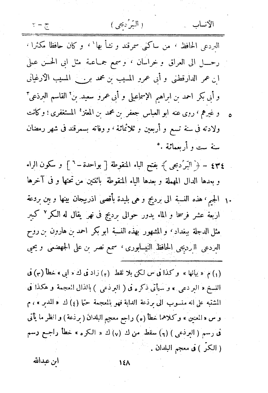 [3] في النسخ «البردعي» وسيأتي ذكره في (البرذعي) بالذال المعجمة وهكذا في المشتبه على انه منسوب الى برذعة الدابة فهو بالمعجمة حتما