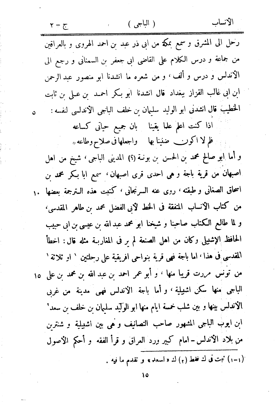 وأما ابو صالح محمد بن الحسن بن بونة (؟) المديني الباجي، شيخ من أهل أصبهان من قرية باجة وهي احدى قرى أصبهان، سمع ابا بكر محمد بن إسحاق الصغاني وطبقته، روى عنه السرنجانى، كتبت هذه الترجمة بعضها من كتاب الأنساب المتفقة في الخط لأبى الفضل محمد بن طاهر المقدسي، ولما طالع الكتاب صاحبنا وشيخنا ابو محمد عبد الله بن عيسى بن ابى حبيب الحافظ الإشبيلي وكان من أهل الصنعة لم ير في المغاربة مثله قال: اخطأ المقدسي في هذا، اما باجة فهي قرية بنواحي افريقية على رحلتين [1] أو ثلاثة [1] من تونس مررت قريبا منها، وأبو عمر احمد بن عبد الله بن محمد بن على الباجي منها سكن اشبيلية، وأما باجة الأندلس فهي مدينة من غربي الأندلس بينها وبين شلب خمسة أيام منها ابو الوليد سليمان بن خلف بن سعد [2] ابن أيوب الباجي المشهور صاحب التصانيف وهي بين اشبيلية وشنترين من بلاد الأندلس- امام كبير ورد العراق وقرأ الفقه وأحكم الأصول