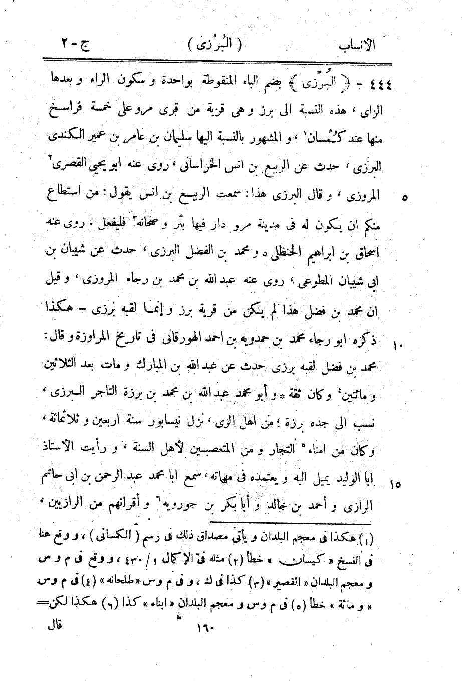 بضم الباء المنقوطة بواحدة وسكون الراء وبعدها الزاى، هذه النسبة الى برز وهي قرية من قرى مرو على خمسة فراسخ منها عند كُمسان [1] ، والمشهور بالنسبة اليها سليمان بن عامر بن عمير الكندي البرزي، حدث عن الربيع بن انس الخراساني، روى عنه ابو يحيى القصري [2] المروزي، وقال البرزي هذا: سمعت الربيع بن انس يقول: من استطاع منكم ان يكون له في مدينة مرو دار فيها بئر وصحانه [3] فليفعل. روى عنه إسحاق بن إبراهيم الحنظليّ ومحمد بن الفضل البرزي، حدث عن شيبان بن ابى شيبان المطوعي، روى عنه عبد الله بن محمد بن رجاء المروزي، وقيل ان محمد بن فضل هذا لم يكن من قرية برز وإنما لقبه برزى- هكذا ذكره ابو رجاء محمد بن حمدويه بن احمد الهورقانى في تاريخ المراوزة وقال:
