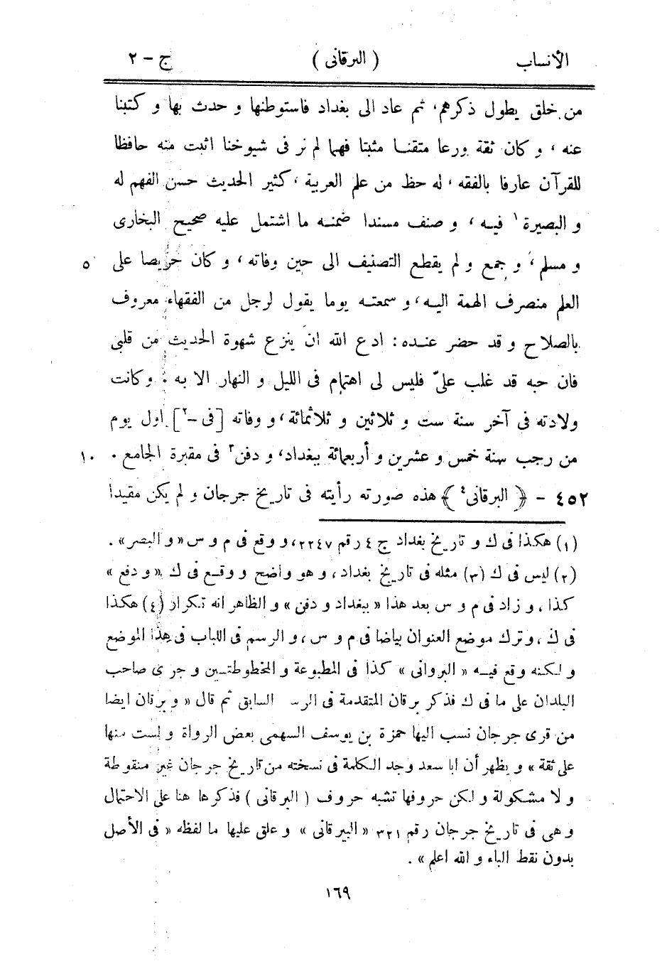 [4] هكذا في ك، وترك موضع العنوان بياضا في م وس، والرسم في اللباب في هذا الموضع ولكنه وقع فيه «البروانى» كذا في المطبوعة والمخطوطتين وجرى صاحب البلدان على ما في ك فذكر برقان المتقدمة في الرسم السابق ثم قال «وبرقان أيضا من قرى جرجان نسب اليها حمزة بن يوسف السهمي بعض الرواة ولست منها على ثقة» ويظهر أن ابا سعد وجد الكلمة في نسخته من تاريخ جرجان غير منقوطة ولا مشكولة ولكن حروفها تشبه حروف (البرقاني) فذكرها هنا على الاحتمال وهي في تاريخ جرجان رقم 321 «البيرقانى» وعلق عليها ما لفظه «في الأصل بدون نقط الباء والله اعلم» .