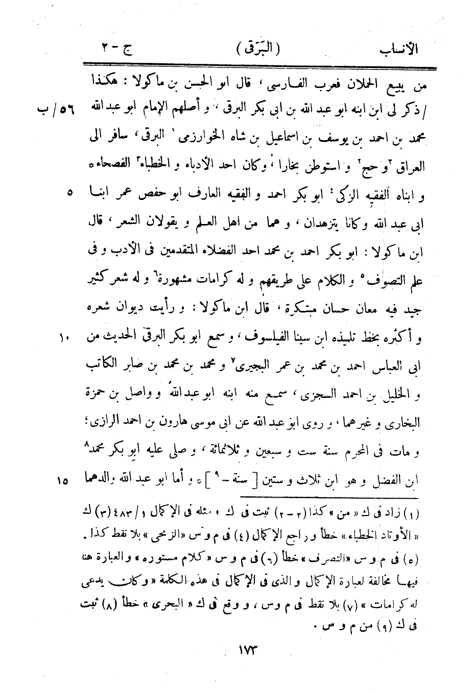 من يبيع الحملان فعرب الفارسي، قال ابو الحسن بن ماكولا: هكذا/ ذكر لي ابن ابنه ابو عبد الله بن ابى بكر البرقي، وأصلهم الإمام ابو عبد الله 56/ ب محمد بن احمد بن يوسف بن إسماعيل بن شاه الخوارزمي [1] البرقي، سافر الى العراق [2] وحج [2] واستوطن بخارا، وكان أحد الأدباء والخطباء [3] الفصحاء وابناه الفقيه الزكي [4] ابو بكر احمد والفقيه العارف ابو حفص عمر ابنا ابى عبد الله وكانا يتزهدان، وهما من أهل العلم ويقولان الشعر، قال ابن ماكولا: ابو بكر احمد بن محمد أحد الفضلاء المتقدمين في الأدب وفي علم التصوف [5] والكلام على طريقهم وله كرامات مشهورة [6] وله شعر كثير جيد فيه معان حسان مبتكرة، قال ابن ماكولا: ورأيت ديوان شعره وأكثره بخط تلميذه ابن سينا الفيلسوف، وسمع ابو بكر البرقي الحديث من ابى العباس احمد بن محمد بن عمر البجيري [7] ومحمد بن محمد بن صابر الكاتب والخليل بن احمد السجزى، سمع منه ابنه ابو عبد الله وواصل بن حمزة البخاري وغيرهما، وروى ابو عبد الله عن ابى موسى هارون بن احمد الرازيّ، ومات في المحرم سنة ست وسبعين وثلاثمائة، وصلى عليه ابو بكر محمد [8] ابن الفضل وهو ابن ثلاث وستين [سنة-[9]] وأما ابو عبد الله والدهما