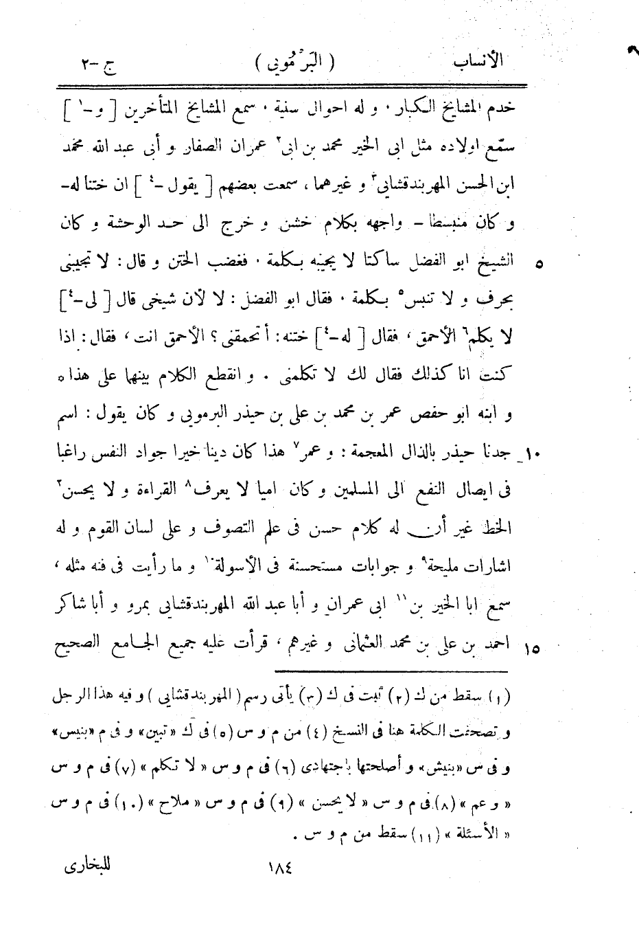 خدم المشايخ الكبار، وله أحوال سنية، سمع المشايخ المتأخرين [و-[1]] سمّع أولاده مثل ابى الخير محمد بن ابى [2] عمران الصفار وأبى عبد الله محمد ابن الحسن المهربندقشايى [3] وغيرهما، سمعت بعضهم [يقول-[4]] ان ختنا له- وكان منبسطا- واجهه بكلام خشن وخرج الى حد الوحشة وكان الشيخ ابو الفضل ساكتا لا يجيبه بكلمة، فغضب الختن وقال: لا تجيبني بحرف ولا تنبس [5] بكلمة، فقال ابو الفضل: لا لأن شيخي قال [لي-[4]] لا يكلم [6] الأحمق، فقال [له-[4]] ختنه: أتحمقني؟ الأحمق أنت، فقال: إذا كنت انا كذلك فقال لك لا تكلمني. وانقطع الكلام بينهما على هذا وابنه ابو حفص عمر بن محمد بن على بن حيذر البرمويى وكان يقول: اسم جدنا حيذر بالذال المعجمة، وعمر [7] هذا كان دينا خيرا جواد النفس راغبا في إيصال النفع الى المسلمين وكان أميا لا يعرف [8] القراءة ولا يحسن [2] الخط غير أن له كلام حسن في علم التصوف وعلى لسان القوم وله إشارات مليحة [9] وجوابات مستحسنة في الأسولة [10] وما رأيت في فنه مثله، سمع ابا الخير بن [11] ابى عمران وأبا عبد الله المهربندقشايى بمرو وأبا شاكر احمد بن على بن محمد العثماني وغيرهم، قرأت عليه جميع الجامع الصحيح