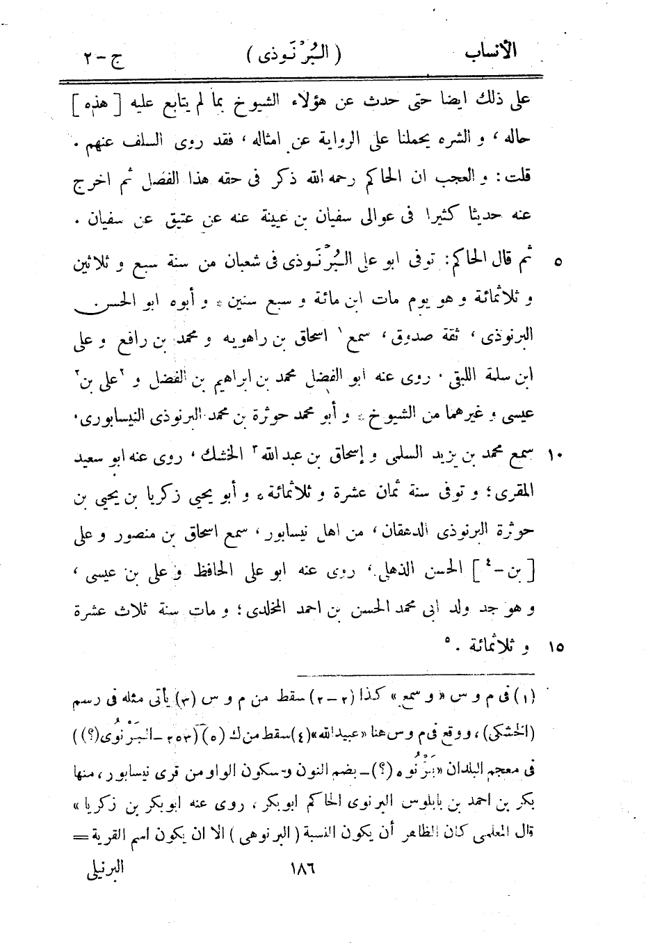 [5] (253- البَرنُوى (؟)) في معجم البلدان «بَرنُوه (؟) - بضم النون وسكون الواو من قرى نيسابور، منها بكر بن احمد بن بابلوس البرنوى الحاكم ابو بكر، روى عنه ابو بكر بن زكريا» قال المعلمي كان الظاهر أن يكون النسبة (البرنوهى) الا ان يكون اسم القرية-