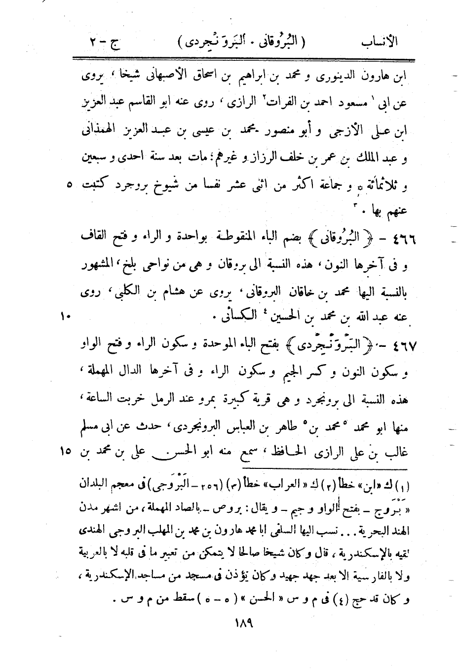 [3] (256- البَروَجى) في معجم البلدان «بروج- بفتح الواو وجيم- ويقال: بروص- بالصاد المهملة، من أشهر مدن الهند البحرية ... نسب اليها السلفي ابا محمد هارون بن محمد بن المهلب البروجي الهندي لقيه بالإسكندرية، قال وكان شيخا صالحا لا يتمكن من تعبير ما في قلبه لا بالعربية ولا بالفارسية الا بعد جهد جهيد وكان يؤذن في مسجد من مساجد الإسكندرية، وكان قد حج