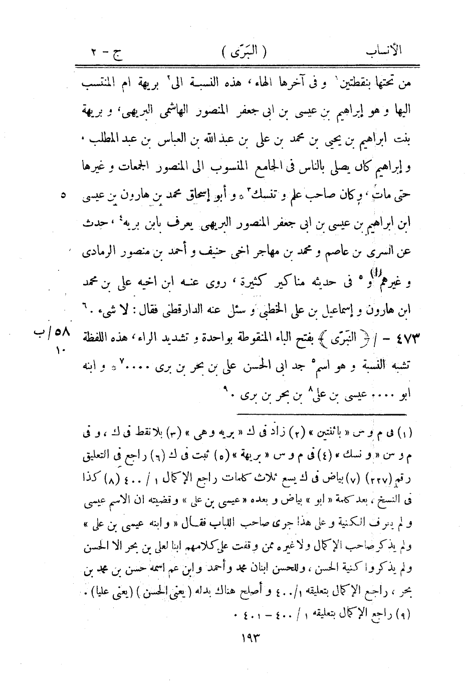 بفتح الباء المنقوطة بواحدة وتشديد الراء، هذه اللفظة 58/ ب تشبه النسبة وهو اسم [5] جد ابى الحسن على بن بحر بن بري ... [7] وابنه ابو ... عيسى بن على [8] بن بحر بن بري. [9]