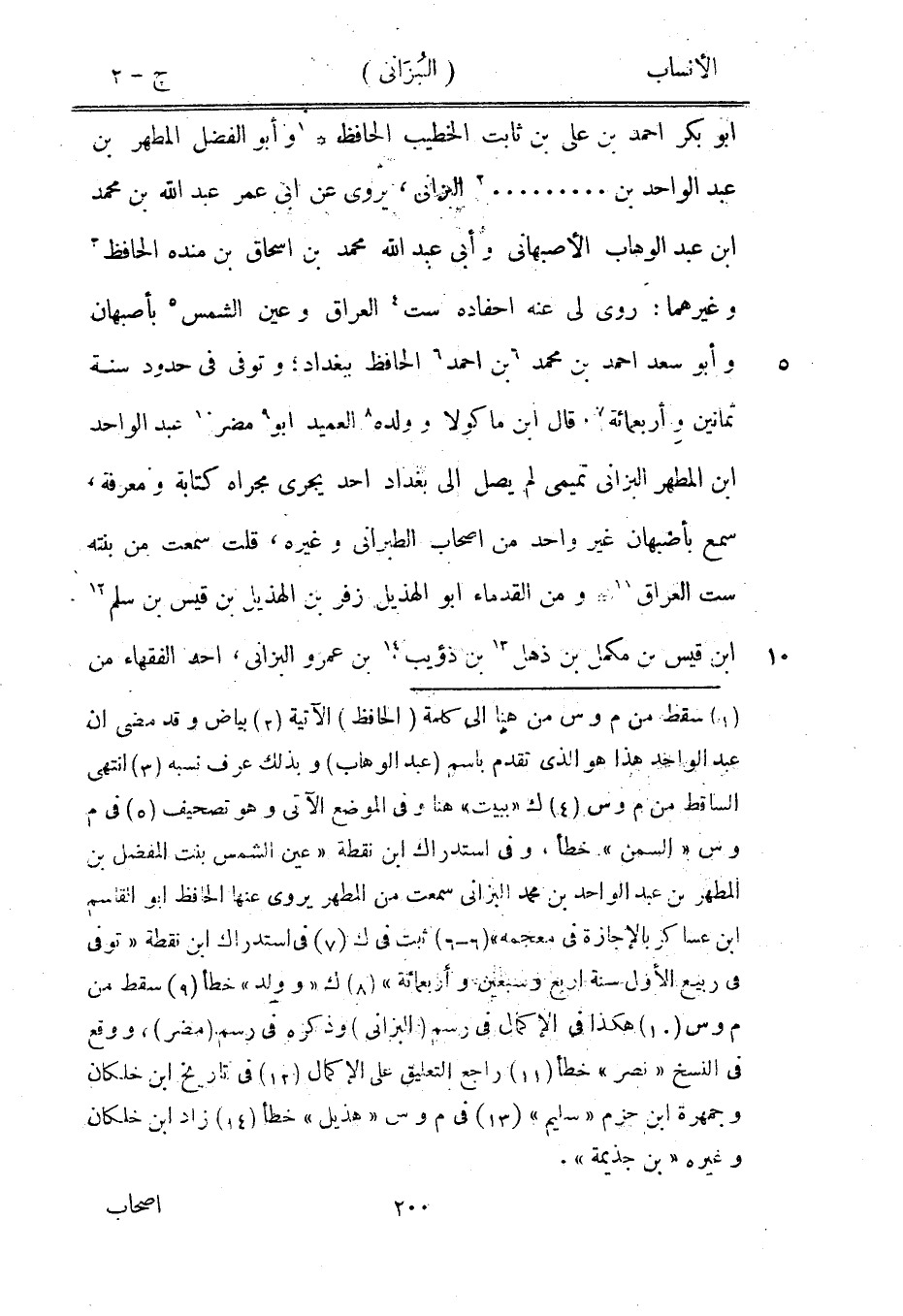 ابو بكر احمد بن على بن ثابت الخطيب الحافظ [1] وأبو الفضل المطهر بن عبد الواحد بن.... [2] البزاني، يروى عن ابى عمر عبد الله بن محمد ابن عبد الوهاب الأصبهاني وأبى عبد الله محمد بن إسحاق بن مندة الحافظ [3] وغيرهما: روى لي عنه أحفاده ست [4] العراق وعين الشمس [5] بأصبهان وأبو سعد احمد بن محمد [6] بن احمد [6] الحافظ ببغداد، وتوفى في حدود سنة ثمانين وأربعمائة [7] ، قال ابن ماكولا وولده [8] العميد ابو [9] مضر [10] عبد الواحد ابن المطهر البزاني تميمى لم يصل الى بغداد أحد يجرى مجراه كتابة ومعرفة، سمع بأصبهان غير واحد من أصحاب الطبراني وغيره، قلت سمعت من بنته ست العراق [11] ومن القدماء ابو الهذيل زفر بن الهذيل بن قيس بن سلم [12] ابن قيس بن مكمل بن ذهل [13] بن ذؤيب [14] ، بن عمرو البزاني، أحد الفقهاء من