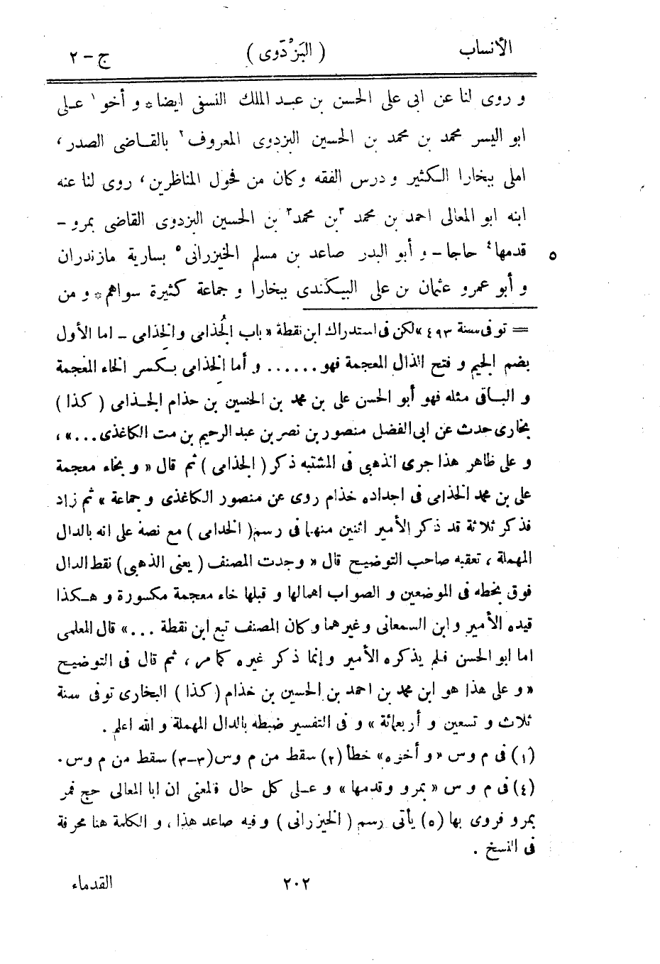 [ (-) ] توفى سنة 493» لكن في استدراك ابن نقطة «باب الجُذامي والخذامى- اما الأول بضم الجيم وفتح الذال المعجمة فهو ... وأما الخذامى بكسر الخاء المعجمة والباقي مثله فهو أبو الحسن على بن محمد بن الحسين بن حذام الجذامي (كذا) بخارى حدث عن ابى الفضل منصور بن نصر بن عبد الرحيم بن مت الكاغذي ... » ، وعلى ظاهر هذا جرى الذهبي في المشتبه ذكر (الجذامي) ثم قال «وبخاء معجمة على بن محمد الخذامى في أجداده خذام روى عن منصور الكاغذي وجماعة» ثم زاد فذكر ثلاثة قد ذكر الأمير اثنين منهما في رسم (الخدامى) مع نصه على انه بالدال المهملة، تعقبه صاحب التوضيح قال «وجدت المصنف (يعنى الذهبي) نقط الدال فوق بخطه في الموضعين والصواب إهمالها وقبلها خاء معجمة مكسورة وهكذا قيده الأمير وابن السمعاني وغيرهما وكان المصنف تبع ابن نقطة ... » قال المعلمي اما ابو الحسن فلم يذكره الأمير وإنما ذكر غيره كما مر، ثم قال في التوضيح «وعلى هذا هو ابن محمد بن احمد بن الحسين بن خذام (كذا) البخاري توفى سنة ثلاث وتسعين وأربعمائة» وفي التفسير ضبطه بالدال المهملة والله اعلم.
