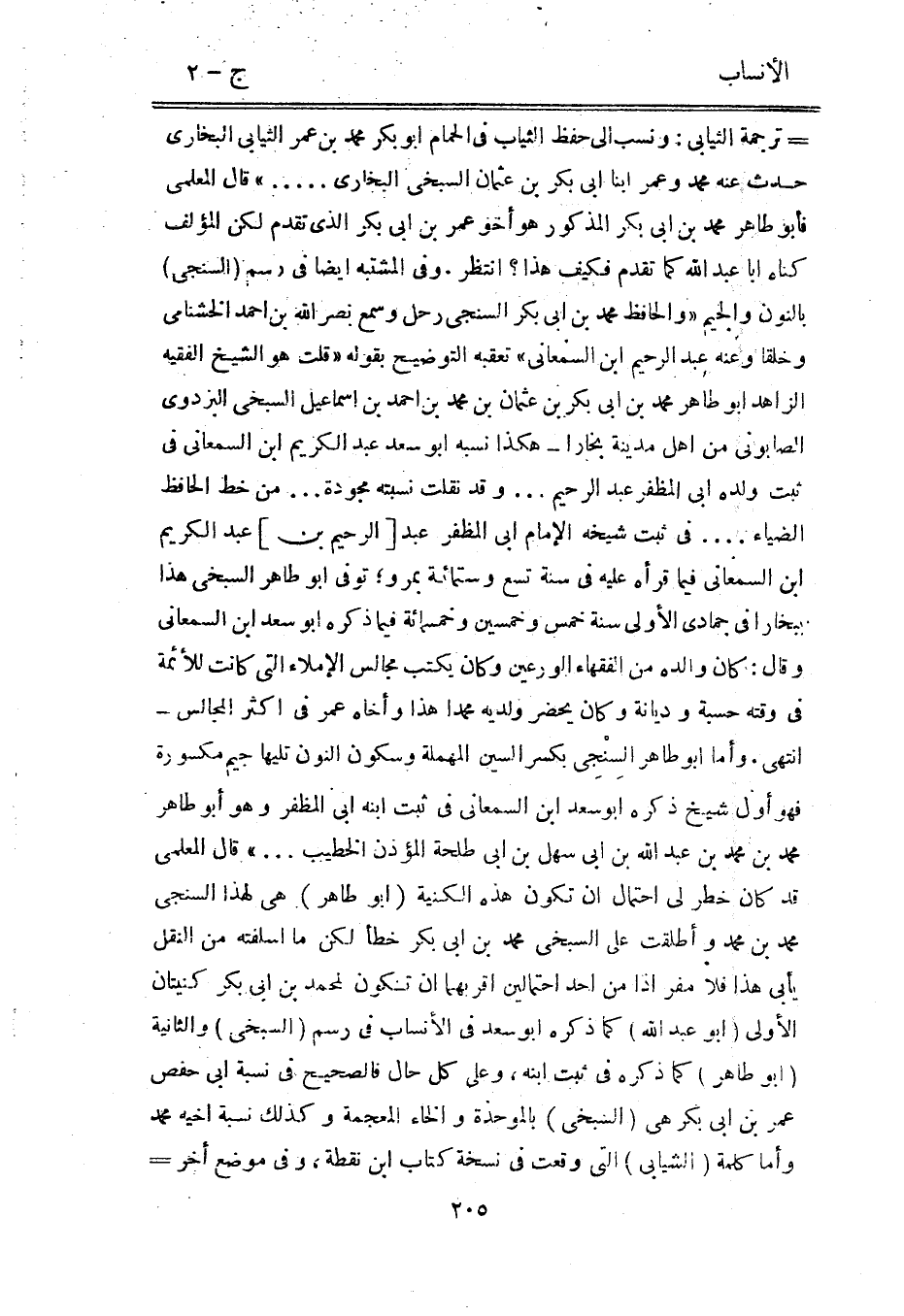 [ (-) ] ترجمة الثيابي: ونسب الى حفظ الثياب في الحمام ابو بكر محمد بن عمر الثيابي البخاري حدث عنه محمد وعمر ابنا ابى بكر بن عثمان السبخى البخاري ... » قال المعلمي فأبو طاهر محمد بن ابى بكر المذكور هو أخو عمر بن ابى بكر الّذي تقدم لكن المؤلف كناه ابا عبد الله كما تقدم فكيف هذا؟ انتظر. وفي المشتبه أيضا في رسم (السنجى) بالنون والجيم «والحافظ محمد بن ابى بكر السنجى رحل وسمع نصر الله بن احمد الخشنامى وخلقا وعنه عبد الرحيم ابن السمعاني» تعقبه التوضيح بقوله «قلت هو الشيخ الفقيه الزاهد ابو طاهر محمد بن ابى بكر بن عثمان بن محمد بن احمد بن إسماعيل السبخى البزدوي الصابوني من أهل مدينة بخارا- هكذا نسبه ابو سعد عبد الكريم ابن السمعاني في ثبت ولده ابى المظفر عبد الرحيم ... وقد نقلت نسبته مجودة ... من خط الحافظ الضياء ... في ثبت شيخه الإمام ابى المظفر عبد [الرحيم بن] عبد الكريم ابن السمعاني فيما قرأه عليه في سنة تسع وستمائة بمرو، توفى ابو طاهر السبخى هذا ببخارا في جمادى الأولى سنة خمس وخمسين وخمسمائة فيما ذكره ابو سعد ابن السمعاني وقال: كان والده من الفقهاء الورعين وكان يكتب مجالس الإملاء التي كانت للأئمة في وقته حسبة وديانة وكان يحضر ولديه محمدا هذا وأخاه عمر في أكثر المجالس- انتهى. وأما ابو طاهر السِنجِى بكسر السين المهملة وسكون النون تليها جيم مكسورة فهو أول شيخ ذكره ابو سعد ابن السمعاني في ثبت ابنه ابى المظفر وهو أبو طاهر محمد بن محمد بن عبد الله بن ابى سهل بن ابى طلحة المؤذن الخطيب ... » قال المعلمي قد كان خطر لي احتمال ان تكون هذه الكنية (ابو طاهر) هي لهذا السنجى محمد بن محمد وأطلقت على السبخى محمد بن ابى بكر خطأ لكن ما أسلفته من النقل يأبى هذا فلا مفر إذا من أحد احتمالين أقربهما ان تكون لمحمد بن ابى بكر كنيتان الأولى (ابو عبد الله) كما ذكره ابو سعد في الأنساب في رسم (السبخى) والثانية (ابو طاهر) كما ذكره في ثبت ابنه، وعلى كل حال فالصحيح في نسبة ابى حفص عمر بن ابى بكر هي (السبخى) بالموحدة والخاء المعجمة وكذلك نسبة أخيه محمد وأما كلمة (الشيابى) التي وقعت في نسخة كتاب ابن نقطة، وفي موضع أخر