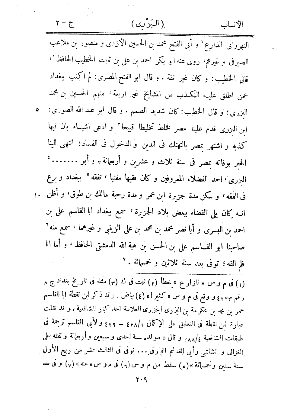 ابن البزري قدم علينا مصر فخلط تخليطا قبيحا [3] وادعى أشياء بان فيها كذبه واشتهر بمصر بالتهتك في الدين والدخول في الفساد، انتهى إلينا الخبر بوفاته بمصر في سنة ثلاث وعشرين وأربعمائة وأبو ... [4] البزري، أحد الفضلاء المعروفين وكان فقيها مفتيا، تفقه [5] ببغداد وبرع في الفقه، وسكن مدة جزيرة ابن عمر ومدة رحبة مالك بن طوق، وأظن انه كان يلي القضاء ببعض بلاد الجزيرة، سمع ببغداد ابا القاسم على بن احمد بن البسري وأبا نصر محمد بن محمد بن على الزينبي وغيرهما، سمع منه [6] صاحبنا ابو القاسم على بن الحسن بن هبة الله الدمشقيّ الحافظ، وأما انا فلم القه، توفى بعد سنة ثلاثين وخمسمائة. [7]