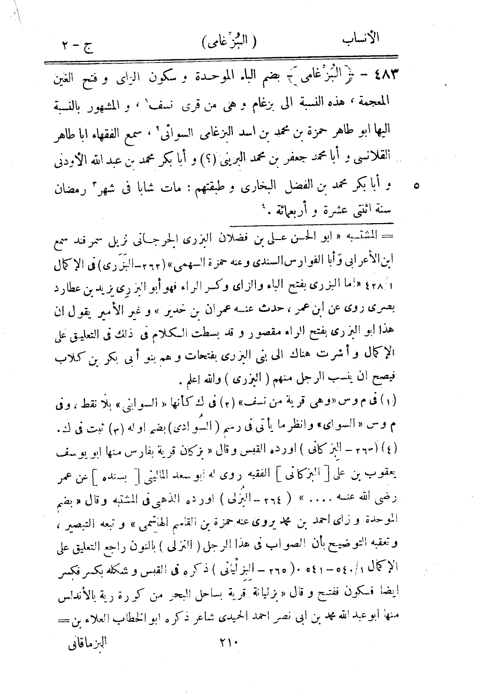 [4] (263- البزكانى) أورده القبس وقال «بزكان قرية بفارس منها ابو يوسف يعقوب بن على [البزكانى] الفقيه روى له ابو سعد الماليني [بسنده] عن عمر رضى الله عنه ... » (264- البُزلى) أورده الذهبي في المشتبه وقال «بضم الموحدة وزاي احمد بن محمد يروى عنه حمزة بن القاسم الهاشمي» وتبعه التبصير، وتعقبه التوضيح بأن الصواب في هذا الرجل (النزلى) بالنون راجع التعليق على الإكمال 1/ 540- 541 (265- البِزِليانى) ذكره في القبس وشكله بكسر فكسر أيضا فسكون ففتح وقال «بزليانة قرية بساحل البحر من كورة رية بالأندلس منها ابو عبد الله محمد بن ابى نصر احمد الحميدي شاعر ذكره ابو الخطاب العلاء بن-