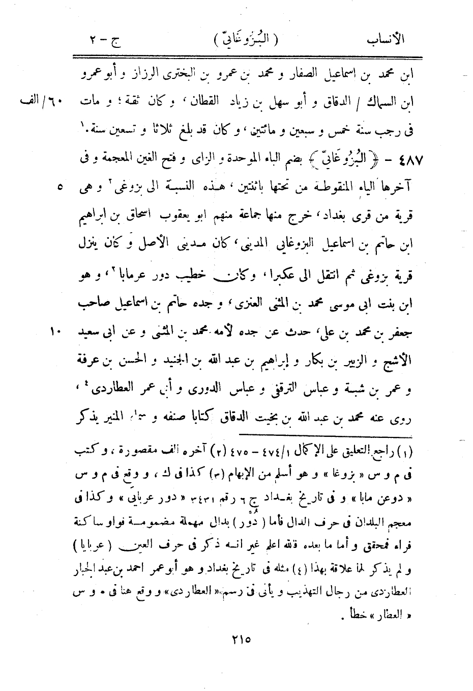 بضم الباء الموحدة والزاى وفتح الغين المعجمة وفي آخرها الياء المنقوطة من تحتها باثنتين، هذه النسبة الى بزوغى [2] وهي قرية من قرى بغداد، خرج منها جماعة منهم ابو يعقوب إسحاق بن إبراهيم ابن حاتم بن إسماعيل البزوغائي المديني، كان مدينى الأصل وكان ينزل قرية بزوغى ثم انتقل الى عكبرا، وكان خطيب دور عرمابا [3] ، وهو ابن بنت ابى موسى محمد بن المثنى العنزي، وجده حاتم بن إسماعيل صاحب جعفر بن محمد بن على، حدث عن جده لأمه محمد بن المثنى وعن ابى سعيد الأشج والزبير بن بكار وإبراهيم بن عبد الله بن الجنيد والحسن بن عرفة وعمر بن شبة وعباس الترقفي وعباس الدوري وأبى عمر العطاردي [4] ، روى عنه محمد بن عبد الله بن بخيت الدقاق كتابا صنفه وسماه المنير يذكر