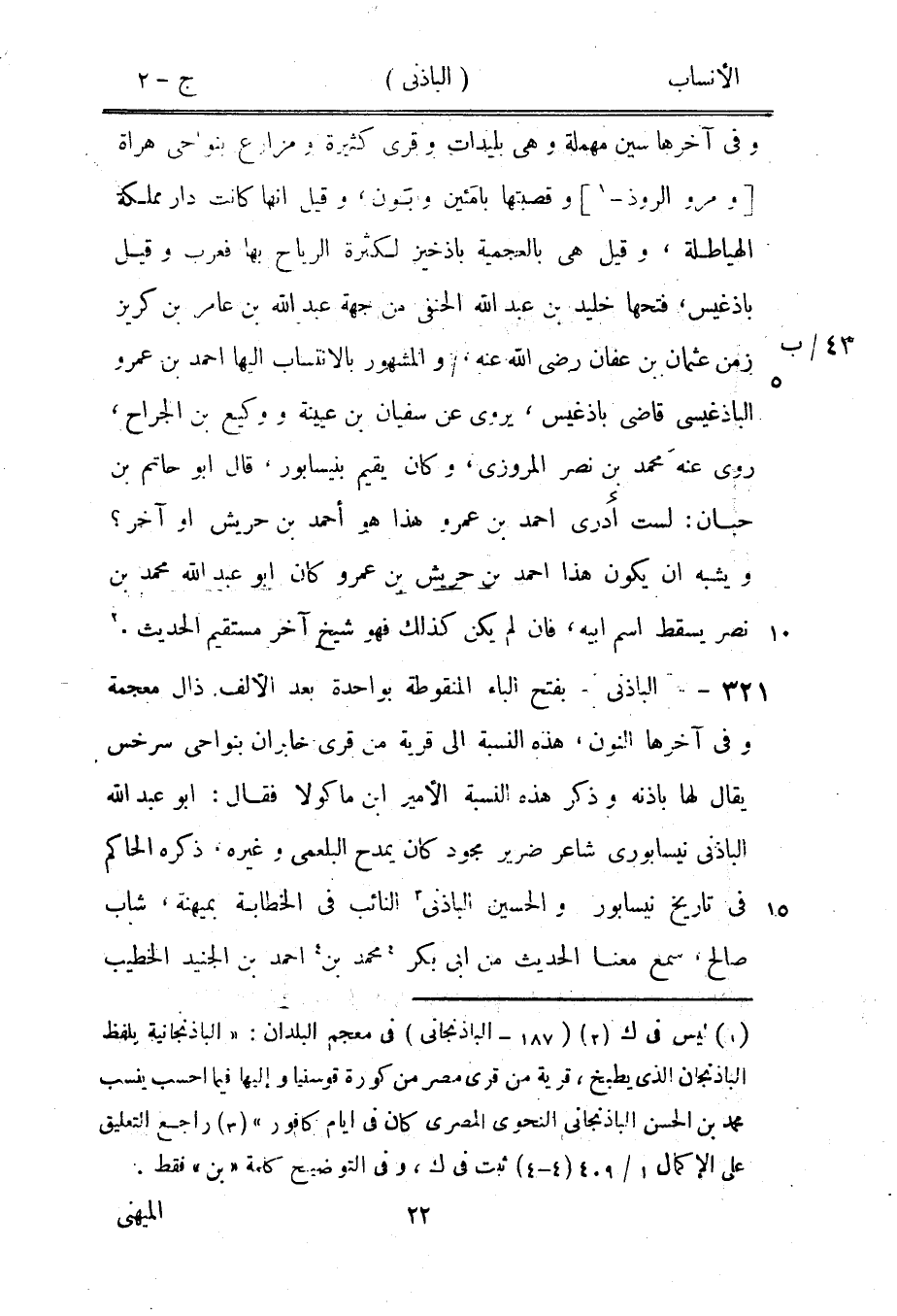 بفتح الباء المنقوطة بواحدة بعد الألف ذال معجمة وفي آخرها النون، هذه النسبة الى قرية من قرى خابران بنواحي سرخس يقال لها باذنه وذكر هذه النسبة الأمير ابن ماكولا فقال: ابو عبد الله الباذنى نيسابوري شاعر ضرير مجود كان يمدح البلعمي وغيره، ذكره الحاكم في تاريخ نيسابور والحسين الباذنى [3] النائب في الخطابة بميهنة، شاب صالح، سمع معنا الحديث من ابى بكر [4] محمد بن [4] احمد بن الجنيد الخطيب