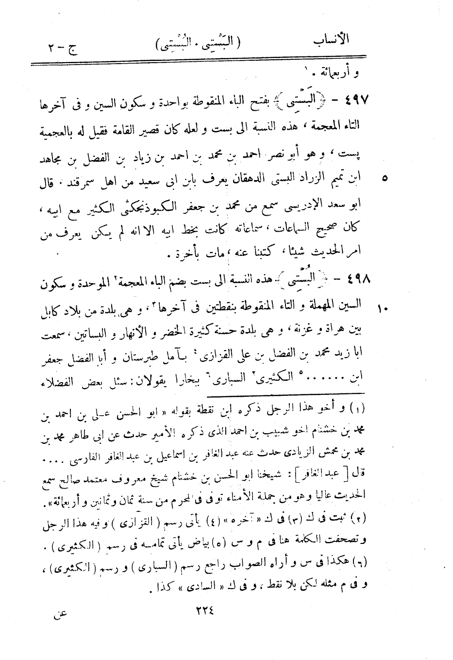 هذه النسبة الى بست بضم الباء المعجمة [2] الموحدة وسكون السين المهملة والتاء المنقوطة بنقطتين في آخرها [3] ، وهي بلدة من بلاد كابل بين هراة وغزنة، وهي بلدة حسنة كثيرة الخضر والأنهار والبساتين، سمعت ابا زيد محمد بن الفضل بن على القزازى [4] بآمل طبرستان وأبا الفضل جعفر ابن ... [5] الكثيري [2] السبارى [6] ببخارا يقولان: سئل بعض الفضلاء