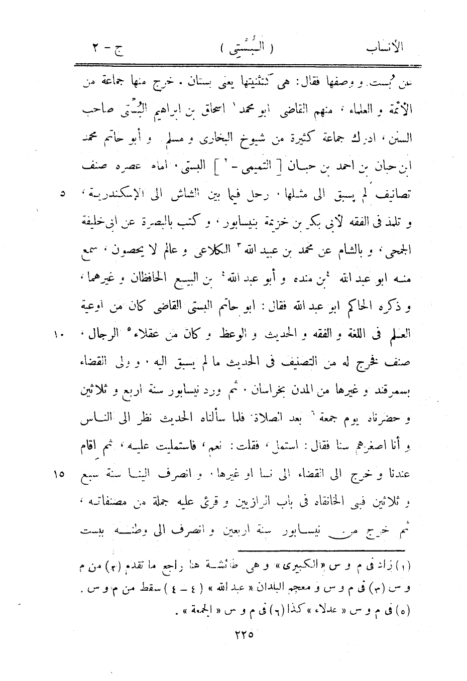 عن بُست ووصفها فقال: هي كتثنيتها يعنى بستان. خرج منها جماعة من الأئمة والعلماء، منهم القاضي ابو محمد [1] إسحاق بن إبراهيم البُستى صاحب السنن، أدرك جماعة كثيرة من شيوخ البخاري ومسلم وأبو حاتم محمد ابن حبان بن احمد بن حبان [التميمي-[2]] البستي، امام عصره صنف تصانيف لم يسبق الى مثلها، رحل فيما بين الشاش الى الإسكندرية، وتلمذ في الفقه لأبى بكر بن خزيمة بنيسابور، وكتب بالبصرة عن ابى خليفة الجمحيّ، وبالشام عن محمد بن عبيد الله [3] الكلاعي وعالم لا يحصون، سمع منه ابو عبد الله [4] بن مندة وأبو عبد الله [4] بن البيع الحافظان وغيرهما، وذكره الحاكم ابو عبد الله فقال: ابو حاتم البستي القاضي كان من اوعية العلم في اللغة والفقه والحديث والوعظ وكان من عقلاء [5] الرجال، صنف فخرج له من التصنيف في الحديث ما لم يسبق اليه، وولى القضاء بسمرقند وغيرها من المدن بخراسان، ثم ورد نيسابور سنة اربع وثلاثين وحضرناه يوم جمعة [6] بعد الصلاة فلما سألناه الحديث نظر الى الناس وأنا أصغرهم سنا فقال: استمل، فقلت: نعم، فاستمليت عليه، ثم اقام عندنا وخرج الى القضاء الى نسا أو غيرها، وانصرف إلينا سنة سبع وثلاثين فبنى الخانقاه في باب الرازيين وقرئ عليه جملة من مصنفاته، ثم خرج من نيسابور سنة أربعين وانصرف الى وطنه ببست