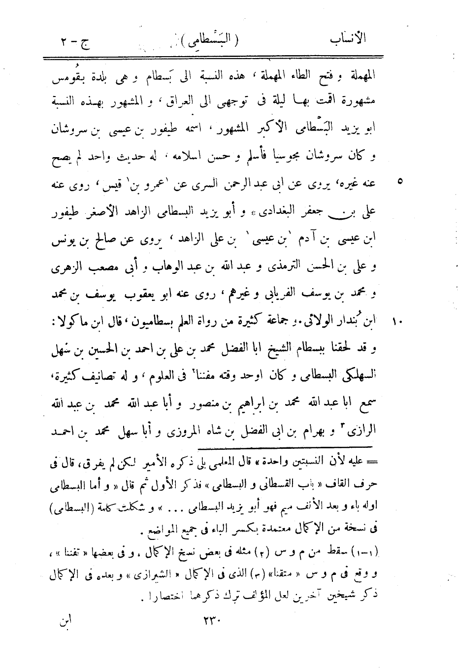 [ () ] عليه لأن النسبتين واحدة» قال المعلمي بلى ذكره الأمير لكن لم يفرق، قال في حرف القاف «باب القسطاني والبسطامي» فذكر الأول ثم قال «وأما البسطامي اوله باء وبعد الألف ميم فهو أبو يزيد البسطامي ... » وشكلت كلمة (البسطامي) في نسخة من الإكمال معتمدة بكسر الباء في جميع المواضع.