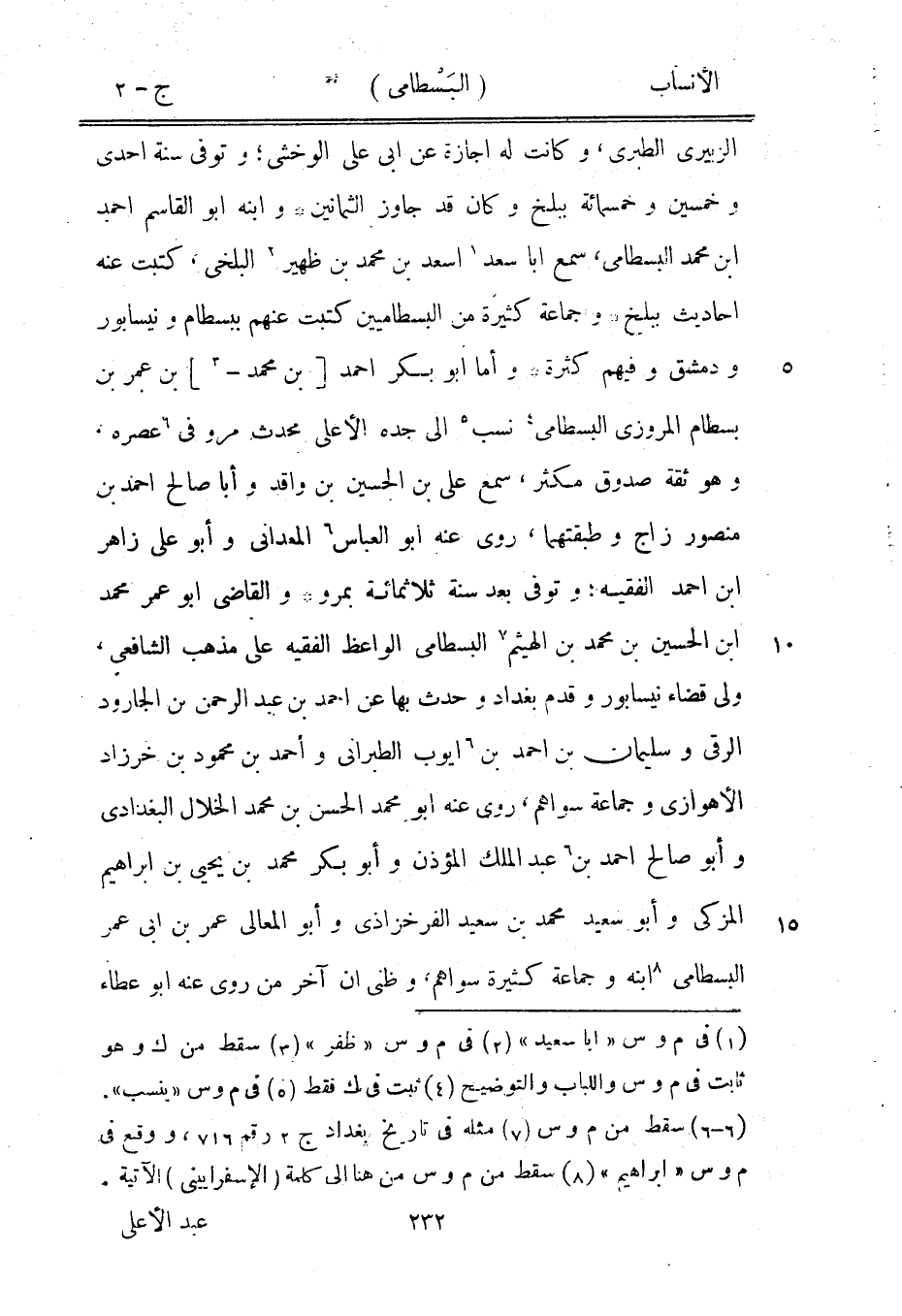 الزبيري الطبري، وكانت له اجازة عن ابى على الوخشى، وتوفى سنة احدى وخمسين وخمسمائة ببلخ وكان قد جاوز الثمانين وابنه ابو القاسم احمد ابن محمد البسطامي، سمع ابا سعد [1] أسعد بن محمد بن ظهير [2] البلخي، كتبت عنه أحاديث ببلخ وجماعة كثيرة من البسطاميين كتبت عنهم ببسطام ونيسابور ودمشق وفيهم كثرة وأما ابو بكر احمد [بن محمد-[3]] بن عمر بن بسطام المروزي البسطامي [4] نسب [5] الى جده الأعلى محدث مرو في [6] عصره، وهو ثقة صدوق مكثر، سمع على بن الحسين بن واقد وأبا صالح احمد بن منصور زاج وطبقتهما، روى عنه ابو العباس [6] المعداني وأبو على زاهر ابن احمد الفقيه، وتوفى بعد سنة ثلاثمائة بمرو والقاضي ابو عمر محمد ابن الحسين بن محمد بن الهيثم [7] البسطامي الواعظ الفقيه على مذهب الشافعيّ، ولى قضاء نيسابور وقدم بغداد وحدث بها عن احمد بن عبد الرحمن بن الجارود الرقى وسليمان بن احمد بن [6] أيوب الطبراني وأحمد بن محمود بن خرزاد الأهوازي وجماعة سواهم، روى عنه ابو محمد الحسن بن محمد الخلال البغدادي وأبو صالح احمد بن [6] عبد الملك المؤذن وأبو بكر محمد بن يحيى بن إبراهيم المزكي وأبو سعيد محمد بن سعيد الفرخزاذى وأبو المعالي عمر بن ابى عمر البسطامي [8] ابنه وجماعة كثيرة سواهم، وظني ان آخر من روى عنه ابو عطاء