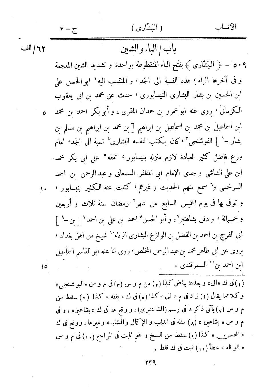 بفتح الباء المنقوطة بواحدة وتشديد الشين المعجمة وفي آخرها الراء، هذه النسبة الى الجد، والمنتسب اليه [1] ابو الحسن على ابن الحسين بن بشار البشاري النيسابورىّ، حدث عن محمد بن ابى يعقوب الكرماني، روى عنه ابو عمرو بن حمدان المقري وأبو بكر احمد بن محمد ابن إسماعيل بن محمد بن إسماعيل بن إبراهيم [بن محمد بن إبراهيم بن مسلم بن بشار-[2]] الفوشنجى [3] ، كان يكتب لنفسه البشاري [4] نسبة الى الجد، امام ورع فاضل كثير العبادة لازم منزله بنيسابور، تفقه [5] على ابى بكر محمد ابن على الشاشي وجدي الإمام ابى المظفر السمعاني وعبد الرحمن بن احمد السرخسي و [6] سمع منهم الحديث وغيرهم، كتبت عنه الكثير بنيسابور، وتوفى بها في يوم الخميس السابع من شهر [6] رمضان سنة ثلاث وأربعين وخمسمائة، ودفن بشاهنبر [7] وأبو الحسن [8] احمد بن على بن احمد [6] [بن-[9]] ابى الفرج بن احمد بن الفضل بن الوازع البشاري الرفّاء [10] شيخ من أهل بغداد، يروى عن ابى طاهر محمد بن عبد الرحمن المخلص، روى لنا عنه ابو القاسم إسماعيل ابن احمد بن [11] السمرقندي.