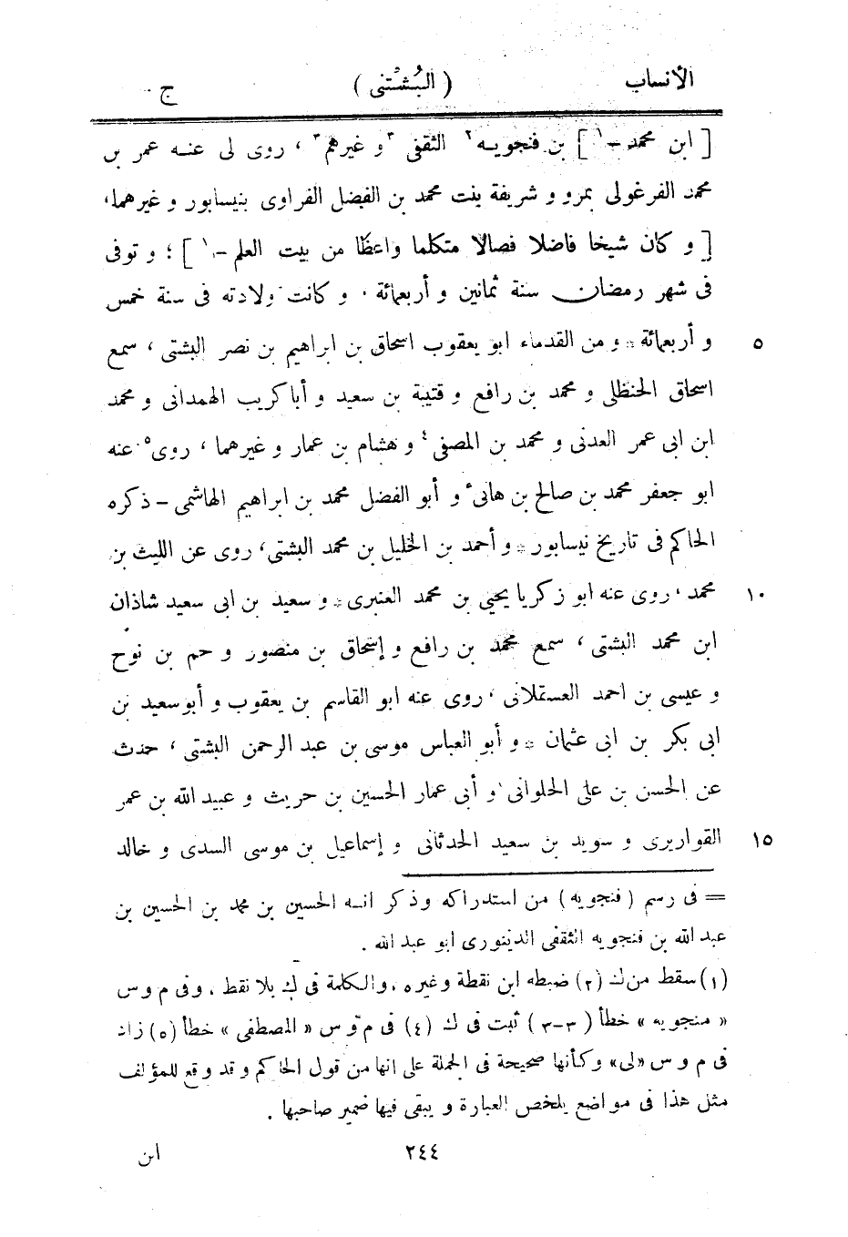 [ابن محمد-[1]] بن فنجويه [2] الثقفي [3] وغيرهم [3] ، روى لي عنه عمر بن محمد الفرغولى بمرو وشريفة بنت محمد بن الفضل الفراوي بنيسابور وغيرهما، [وكان شيخا فاضلا فصالا متكلما واعظا من بيت العلم-[1]] ، وتوفى في شهر رمضان سنة ثمانين وأربعمائة، وكانت ولادته في سنة خمس وأربعمائة ومن القدماء ابو يعقوب إسحاق بن إبراهيم بن نصر البشتي، سمع إسحاق الحنظليّ ومحمد بن رافع وقتيبة بن سعيد وأبا كريب الهمدانيّ ومحمد ابن ابى عمر العدني ومحمد بن المصفى [4] وهشام بن عمار وغيرهما، روى [5] عنه ابو جعفر محمد بن صالح بن هانئ وأبو الفضل محمد بن إبراهيم الهاشمي- ذكره الحاكم في تاريخ نيسابور وأحمد بن الخليل بن محمد البشتي، روى عن الليث بن محمد، روى عنه ابو زكريا يحيى بن محمد العنبري وسعيد بن ابى سعيد شاذان ابن محمد البشتي، سمع محمد بن رافع وإسحاق بن منصور وحم بن نوح وعيسى بن احمد العسقلاني، روى عنه ابو القاسم بن يعقوب وأبو سعيد بن ابى بكر بن ابى عثمان وأبو العباس موسى بن عبد الرحمن البشتي، حدث عن الحسن بن على الحلواني وأبى عمار الحسين بن حريث وعبيد الله بن عمر القواريري وسويد بن سعيد الحدثانى وإسماعيل بن موسى السدي وخالد
