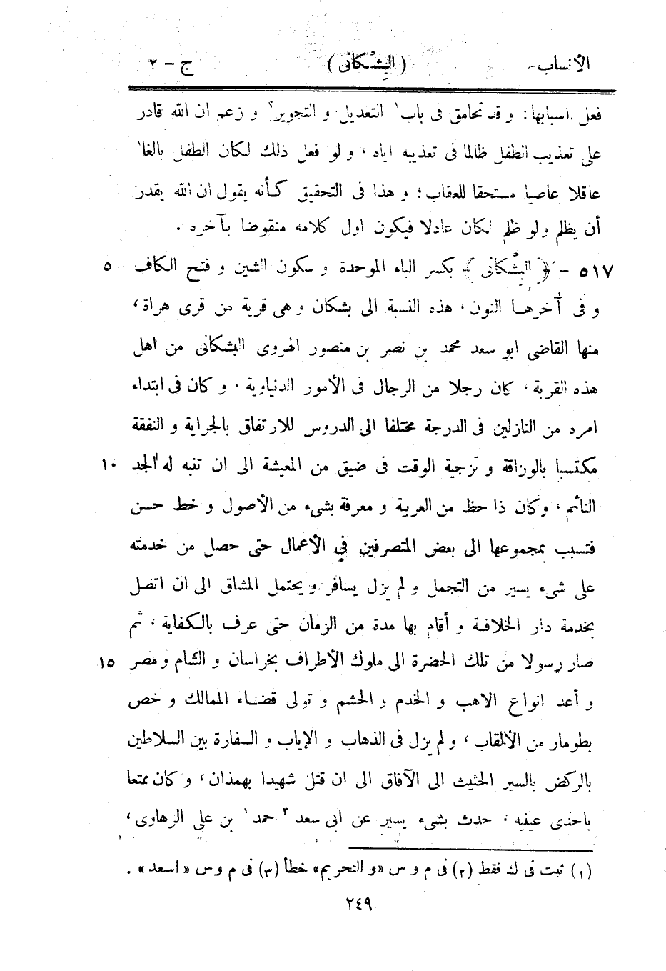 بكسر الباء الموحدة وسكون الشين وفتح الكاف وفي آخرها النون، هذه النسبة الى بشكان وهي قرية من قرى هراة، منها القاضي ابو سعد محمد بن نصر بن منصور الهروي البشكانى من أهل هذه القرية، كان رجلا من الرجال في الأمور الدنياوية. وكان في ابتداء امره من النازلين في الدرجة مختلفا الى الدروس للارتفاق بالجراية والنفقة مكتسبا بالوراقة وتزجية الوقت في ضيق من المعيشة الى ان تنبه له الجد النائم، وكان ذا حظ من العربية ومعرفة بشيء من الأصول وخط حسن فتسبب بمجموعها الى بعض المتصرفين في الأعمال حتى حصل من خدمته على شيء يسير من التجمل ولم يزل يسافر ويحتمل المشاق الى ان اتصل بخدمة دار الخلافة وأقام بها مدة من الزمان حتى عرف بالكفاية، ثم صار رسولا من تلك الحضرة الى ملوك الأطراف بخراسان والشام ومصر وأعد أنواع الأهب والخدم والحشم وتولى قضاء الممالك وخص بطومار من الألقاب، ولم يزل في الذهاب والإياب والسفارة بين السلاطين بالركض بالسير الحثيث الى الآفاق الى ان قتل شهيدا بهمذان، وكان ممتعا بإحدى عينيه، حدث بشيء يسير عن ابى سعد [3] حمد [1] بن على الرهاوي،