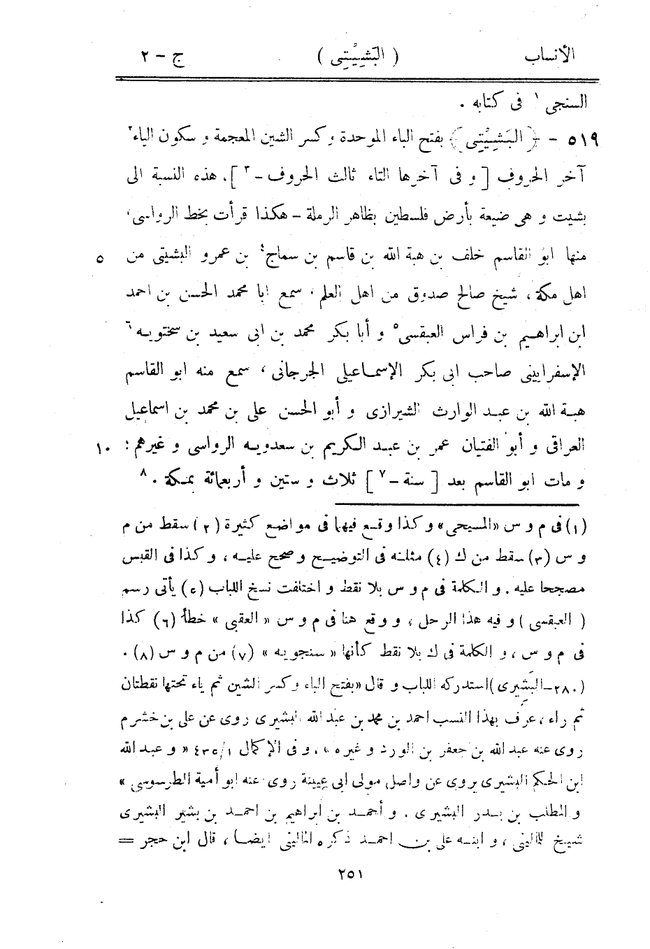 (280- البَشِيرى) استدركه اللباب وقال «بفتح الباء وكسر الشين ثم ياء تحتها نقطتان ثم راء، عرف بهذا النسب احمد بن محمد بن عبد الله البشيري روى عن على بن خشرم روى عنه عبد الله بن جعفر بن الورد وغيره» ، وفي الإكمال 1/ 435 «وعبد الله ابن الحكم البشيري يروى عن واصل مولى ابى عيينة روى عنه ابو أمية الطرسوسي» والمطلب بن بدر البشيري، وأحمد بن إبراهيم بن احمد بن بشير البشيري شيخ للمالينى، وابنه على بن احمد ذكره الماليني أيضا، قال ابن حجر-