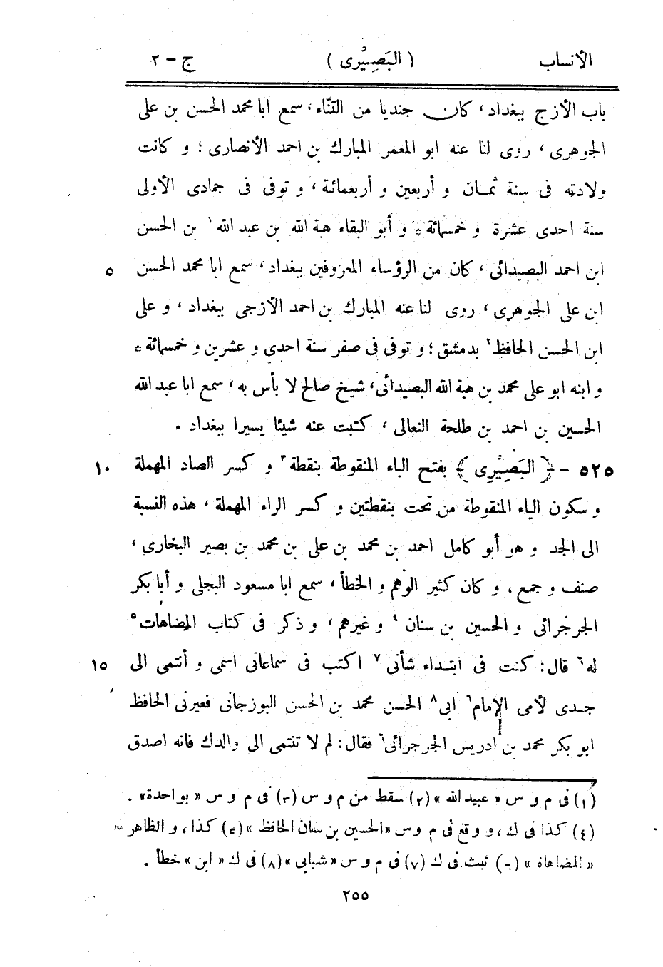 بفتح الباء المنقوطة بنقطة [3] وكسر الصاد المهملة وسكون الياء المنقوطة من تحت بنقطتين وكسر الراء المهملة، هذه النسبة الى الجد وهو أبو كامل احمد بن محمد بن على بن محمد بن بصير البخاري، صنف وجمع، وكان كثير الوهم والخطأ، سمع ابا مسعود البجلي وأبا بكر الجرجرائى والحسين بن سنان [4] وغيرهم، وذكر في كتاب المضاهاة [5] له [6] قال: كنت في ابتداء شأنى [7] اكتب في سماعاتي اسمى وأنتمي الى جدي لأمى الإمام [6] ابى [8] الحسن محمد بن الحسن البوزجاني فعيرنى الحافظ ابو بكر محمد بن إدريس الجرجرائى [6] فقال: لم لا تنتمى الى والدك فإنه اصدق