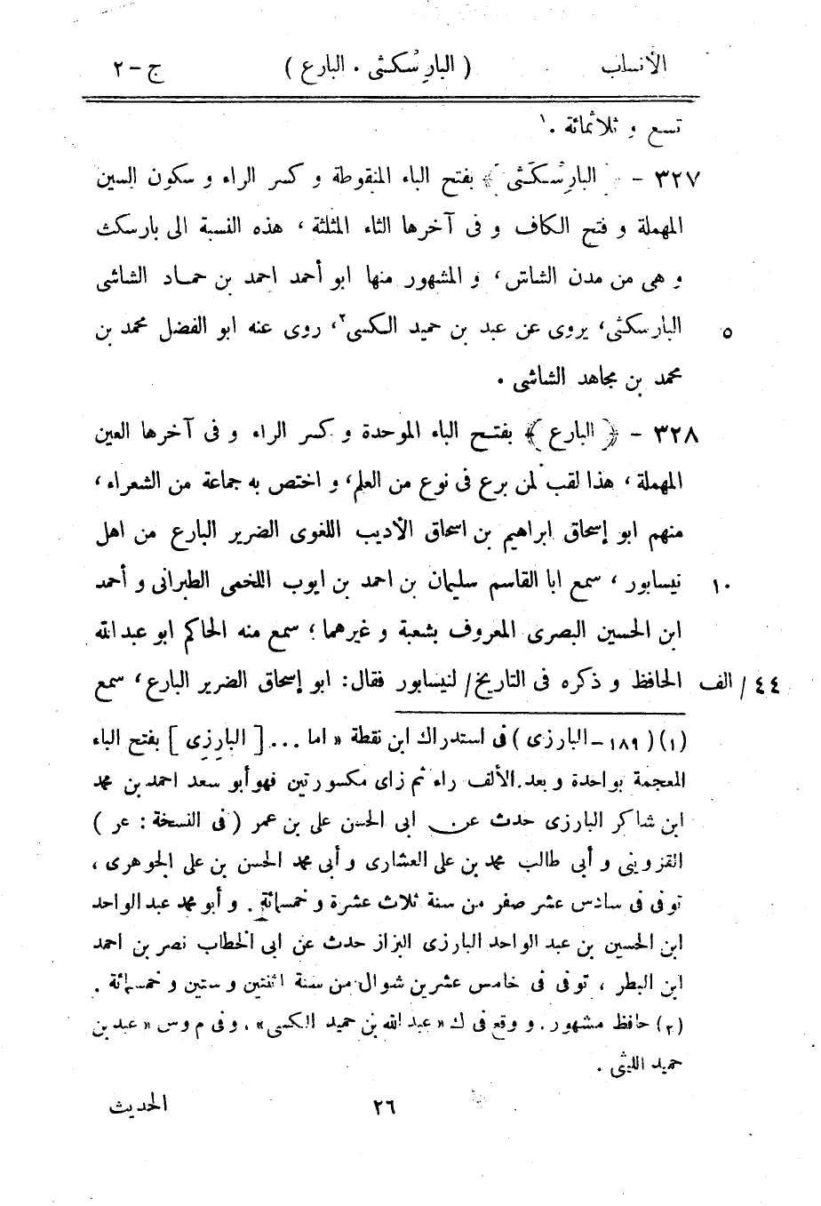 [1] (189- البارزي) في استدراك ابن نقطة «اما ... [البارزي] بفتح الباء المعجمة بواحدة وبعد الألف راء ثم زاي مكسورتين فهو أبو سعد احمد بن محمد ابن شاكر البارزي حدث عن ابى الحسن على بن عمر (في النسخة: عر) القزويني وأبى طالب محمد بن على العشاري وأبى محمد الحسن بن على الجوهري، توفى في سادس عشر صفر من سنة ثلاث عشرة وخمسمائة. وأبو محمد عبد الواحد ابن الحسين بن عبد الواحد البارزي البزاز حدث عن ابى الخطاب نصر بن احمد ابن البطر، توفى في خامس عشرين شوال من سنة اثنتين وستين وخمسمائة.