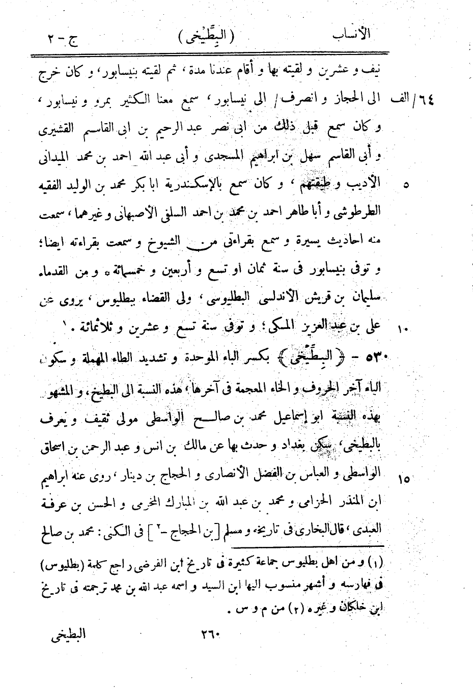 نيف وعشرين ولقيته بها وأقام عندنا مدة، ثم لقيته بنيسابور، وكان خرج 64/ ألف الى الحجاز وانصرف/ الى نيسابور، سمع معنا الكثير بمرو ونيسابور، وكان سمع قبل ذلك من ابى نصر عبد الرحيم بن ابى القاسم القشيري وأبى القاسم سهل بن إبراهيم المسجدي وأبى عبد الله احمد بن محمد الميداني الأديب وطبقتهم، وكان سمع بالإسكندرية ابا بكر محمد بن الوليد الفقيه الطرطوشي وأبا طاهر احمد بن محمد بن احمد السلفي الأصبهاني وغيرهما، سمعت منه أحاديث يسيرة وسمع بقراءتي من الشيوخ وسمعت بقراءته أيضا، وتوفى بنيسابور في سنة ثمان أو تسع وأربعين وخمسمائة ومن القدماء سليمان بن قريش الأندلسى البطليوسي، ولى القضاء ببطليوس، يروى عن على بن عبد العزيز المكيّ، وتوفى سنة تسع وعشرين وثلاثمائة. [1]