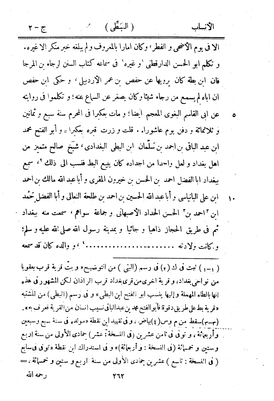 [2] في رسم (البتي) من التوضيح «وبتّ قرية قرب بعقوبا من نواحي بغداد، وقرية اخرى من قرى بغداد قرب الراذان لكن المشهور في هذه انها بالطاء المهملة وإليها ينسب ابو الفتح ابن البطي» وفي رسم (البطي) من المشتبه «قرية بط على طريق دقوقا فأبو الفتح محمد بن عبد الباقي نسيب إنسان من القرية فعرف به» .