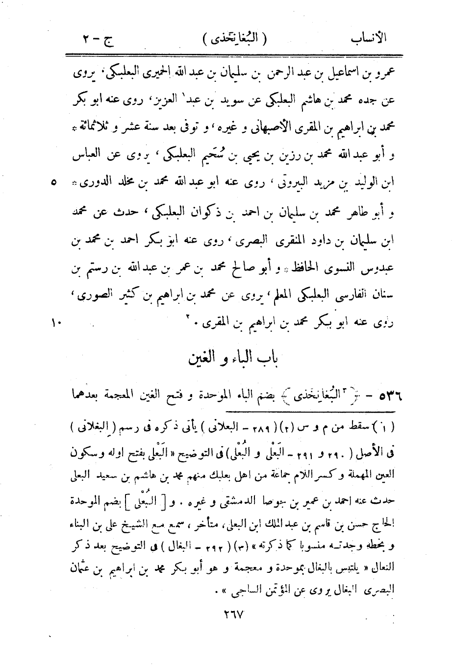 [2] (289- البعلانى) يأتى ذكره في رسم (البغلاني) في الأصل (290 و 291- البعلي والبعلي) في التوضيح «البعلي بفتح اوله وسكون العين المهملة وكسر اللام جماعة من أهل بعلبكّ منهم محمد بن هاشم بن سعيد البعلي حدث عنه احمد بن عمير بن جوصا الدمشقيّ وغيره. و [البعلي] بضم الموحدة الحاج حسن بن قاسم بن عبد الملك ابن البعلي، متأخر، سمع مع الشيخ على بن البناء وبخطه وجدته منسوبا كما ذكرته»