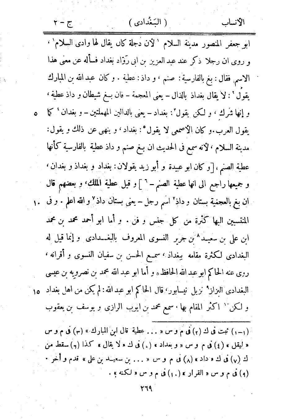 مدينة السلام، لأنه سمع في الحديث ان بغ صنم وداذ عطية بالفارسية كأنها عطية الصنم، [وكان ابو عبيدة وأبو زيد يقولان: بغداد وبغداذ وبغدان، وجميعها راجع الى انها عطية الصنم-[6]] وقيل عطية الملك، وبعضهم قال ان بغ بالعجمية بستان وداذ [7] اسم رجل- يعنى بستان داذ [7] والله اعلم. وفي المنتسبين اليها كثرة من كل جنس وفن. وأما ابو أحمد محمد بن محمد ابن على بن سعيد [8] بن جرير النسوي المعروف بالبغدادي وإنما قيل له البغدادي لكثرة مقامه ببغداذ، سمع الحسن بن سفيان النسوي وأقرانه، روى عنه الحاكم ابو عبد الله الحافظ وأما ابو عبد الله محمد بن نصرويه بن عيسى البغدادي البزاز [9] نزيل نيسابور، قال الحاكم ابو عبد الله: لم يكن من أهل بغداد ولكن [10] أكثر المقام بها، سمع محمد بن أيوب الرازيّ ويوسف بن يعقوب