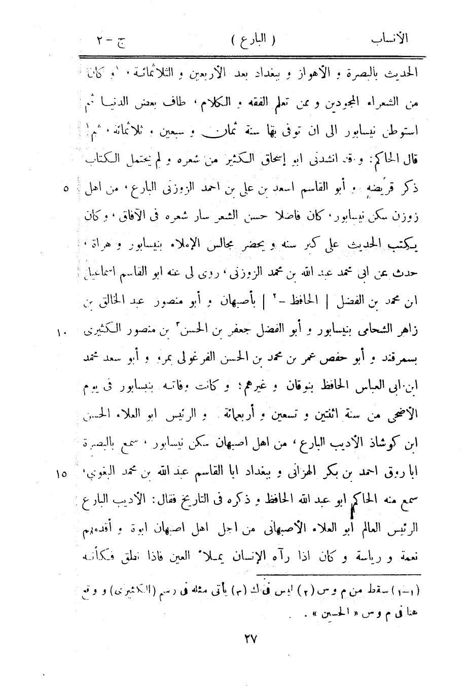 الحديث بالبصرة والأهواز وببغداد بعد الأربعين والثلاثمائة، [1] وكان من الشعراء المجودين وممن تعلم الفقه والكلام، طاف بعض الدنيا ثم استوطن نيسابور الى ان توفى بها سنة ثمان وسبعين وثلاثمائة، ثم [1] قال الحاكم: وقد انشدنى ابو إسحاق الكثير من شعره ولم يحتمل الكتاب ذكر قريضه وأبو القاسم أسعد بن على بن احمد الزوزنى البارع، من أهل زوزن سكن نيسابور، كان فاضلا حسن الشعر سار شعره في الآفاق، وكان يكتب الحديث على كبر سنه ويحضر مجالس الإملاء بنيسابور وهراة، حدث عن ابى محمد عبد الله بن محمد الزوزنى، روى لي عنه ابو القاسم إسماعيل ابن محمد بن الفضل [الحافظ-[2]] بأصبهان وأبو منصور عبد الخالق بن زاهر الشحامي بنيسابور وأبو الفضل جعفر بن الحسن [3] بن منصور الكثيري بسمرقند وأبو حفص عمر بن محمد بن الحسن الفرغولى بمرو وأبو سعد محمد ابن ابى العباس الحافظ بنوقان وغيرهم، وكانت وفاته بنيسابور في يوم الأضحى من سنة اثنتين وتسعين وأربعمائة والرئيس ابو العلاء الحسن ابن كوشاذ الأديب البارع، من أهل أصبهان سكن نيسابور، سمع بالبصرة ابا روق احمد بن بكر الهزانى وببغداد ابا القاسم عبد الله بن محمد البغوي، سمع منه الحاكم ابو عبد الله الحافظ وذكره في التاريخ فقال: الأديب البارع الرئيس العالم ابو العلاء الأصبهاني من أجل أهل أصبهان ابوة وأقدمهم نعمة ورياسة وكان إذا رآه الإنسان يملأ العين فإذا نطق فكأنه