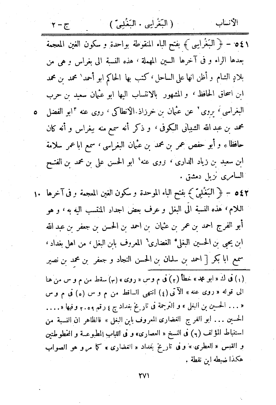 بفتح الباء الموحدة وسكون الغين المعجمة وفي آخرها اللام، هذه النسبة الى البغل وعرف بعض أجداد المنتسب اليه به، وهو أبو الفرج احمد بن عمر بن عثمان بن احمد بن الحسن بن جعفر بن عبد الله ابن يحيى بن الحسين البغلي [5] الغضارى [6] المعروف بابن البغل، من أهل بغداد، سمع ابا بكر [احمد بن سلمان بن الحسن النجاد وجعفر بن محمد بن نصير