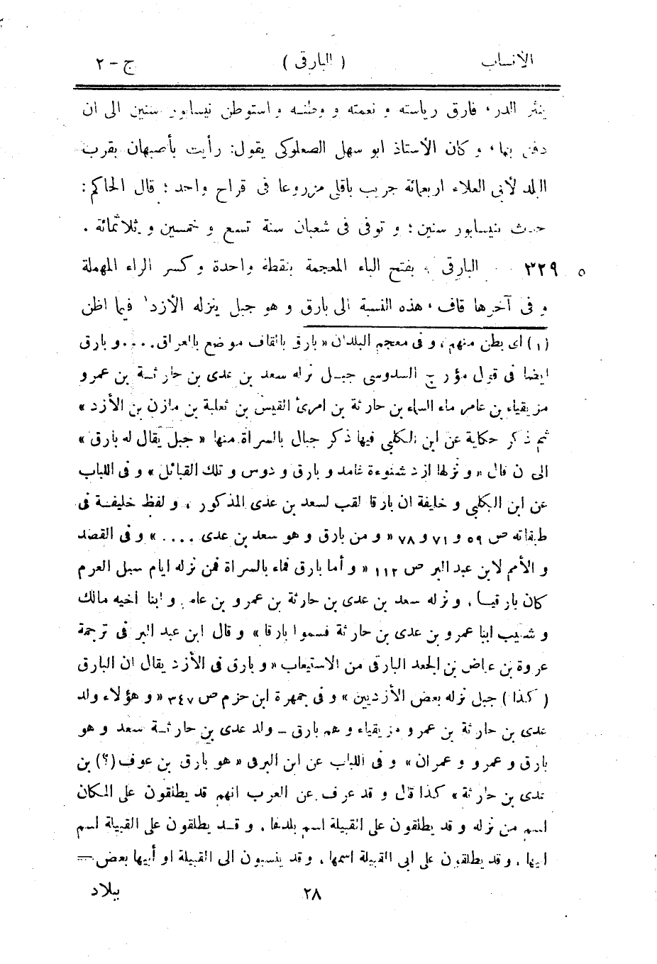[1] اى بطن منهم، وفي معجم البلدان «بارق بالقاف موضع بالعراق ... وبارق أيضا في قول مؤرج السدوسي جبل نرله سعد بن عدي بن حارثة بن عمرو مزيقياء بن عامر ماء السماء بن حارثة بن امرئ القيس بن ثعلبة بن مازن بن الأزد» ثم ذكر حكاية عن ابن الكلبي فيها ذكر جبال بالسراة منها «جبل يقال له بارق» الى ان قال «ونزلها ازد شنوءة غامد وبارق ودوس وتلك القبائل» وفي اللباب عن ابن الكلبي وخليفة ان بارقا لقب لسعد بن عدي المذكور، ولفظ خليفة في طبقاته ص 59 و 71 و 78 «ومن بارق وهو سعد بن عدي ... » وفي القصد والأمم لابن عبد البر ص 112 «وأما بارق فماء بالسراة فمن نزله أيام سبل العرم كان بارقيا، ونزله سعد بن عدي بن حارثة بن عمرو بن عامر وابنا أخيه مالك وشيب ابنا عمرو بن عدي بن حارثة فسموا بارقا» وقال ابن عبد البر في ترجمة عروة بن عياض بن الجعد البارقي من الاستيعاب «وبارق في الأزد يقال ان البارق (كذا) جبل نزله بعض الأزديين» وفي جمهرة ابن حزم ص 347 «وهؤلاء ولد عدي بن حارثة بن عمرو مزيقياء وهم بارق- ولد عدي بن حارثة سعد وهو بارق وعمرو وعمران» وفي اللباب عن ابن البرقي «هو بارق بن عوف (؟) بن عدي بن حارثة» كذا قال وقد عرف عن العرب انهم قد يطلقون على المكان اسم من نزله وقد يطلقون على القبيلة اسم بلدها، وقد يطلقون على القبيلة اسم أبيها، وقد يطلقون على ابى القبيلة اسمها، وقد ينسبون الى القبيلة أو أبيها بعض-