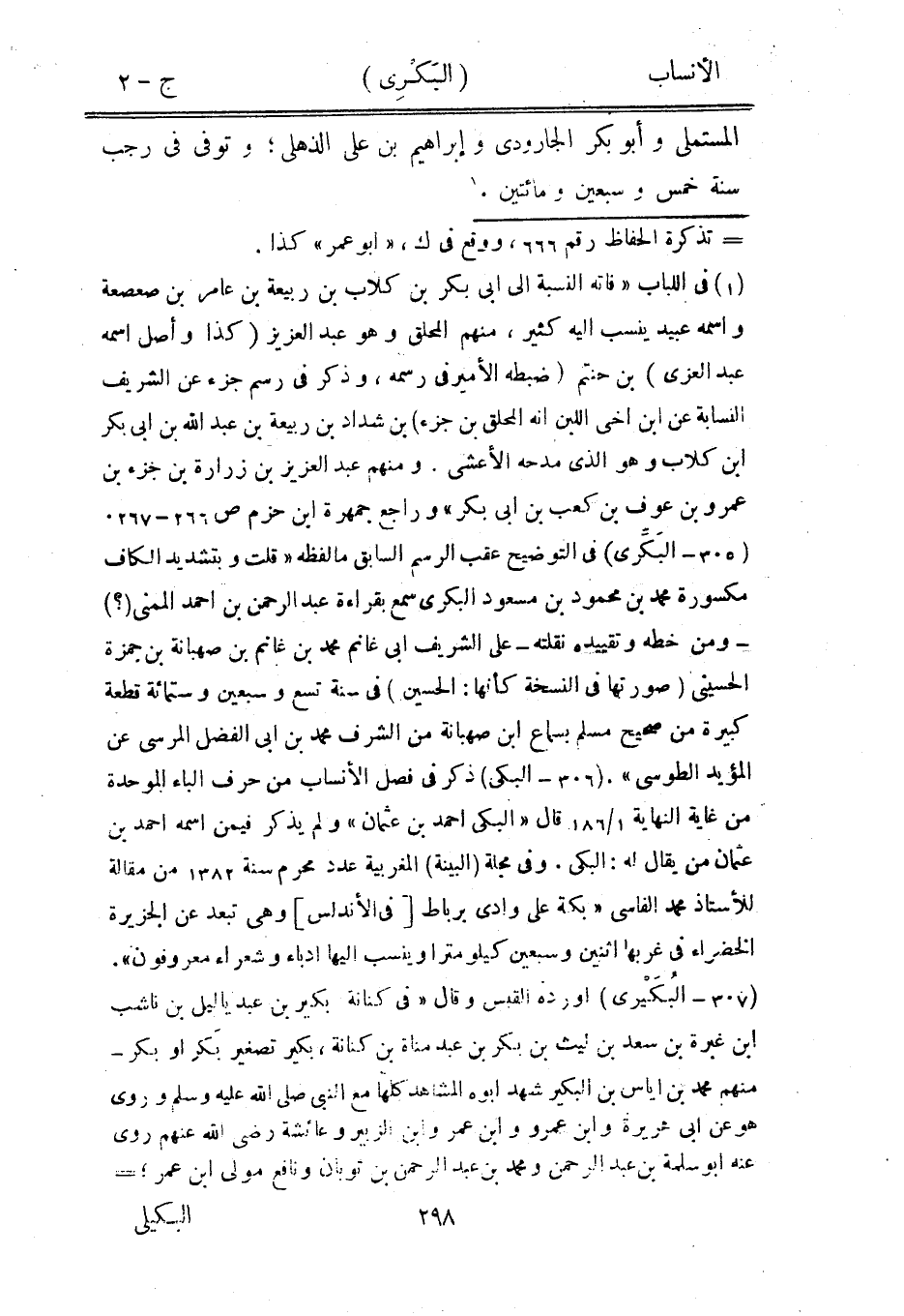 (305- البكّرى) في التوضيح عقب الرسم السابق ما لفظه «قلت وبتشديد الكاف مكسورة محمد بن محمود بن مسعود البكري سمع بقراءة عبد الرحمن بن احمد الممنى (؟) - ومن خطه وتقييده نقلته- على الشريف ابى غانم محمد بن غانم بن صهبانة بن حمزة الحسيني (صورتها في النسخة كأنها: الحسين) في سنة تسع وسبعين وستمائة قطعة كبيرة من صحيح مسلم بسماع ابن صهبانة من الشرف محمد بن ابى الفضل المرسي عن المؤيد الطوسي» . (306- البكى) ذكر في فصل الأنساب من حرف الباء الموحدة من غاية النهاية 1/ 186 قال «البكى احمد بن عثمان» ولم يذكر فيمن اسمه احمد بن عثمان من يقال له: البكى. وفي مجلة (البينة) المغربية عدد محرم سنة 1382 من مقالة للأستاذ محمد الفاسى «بكة على وادي برباط [في الأندلس] وهي تبعد عن الجزيرة الخضراء في غربها اثنين وسبعين كيلومترا وينسب اليها أدباء وشعراء معروفون» .